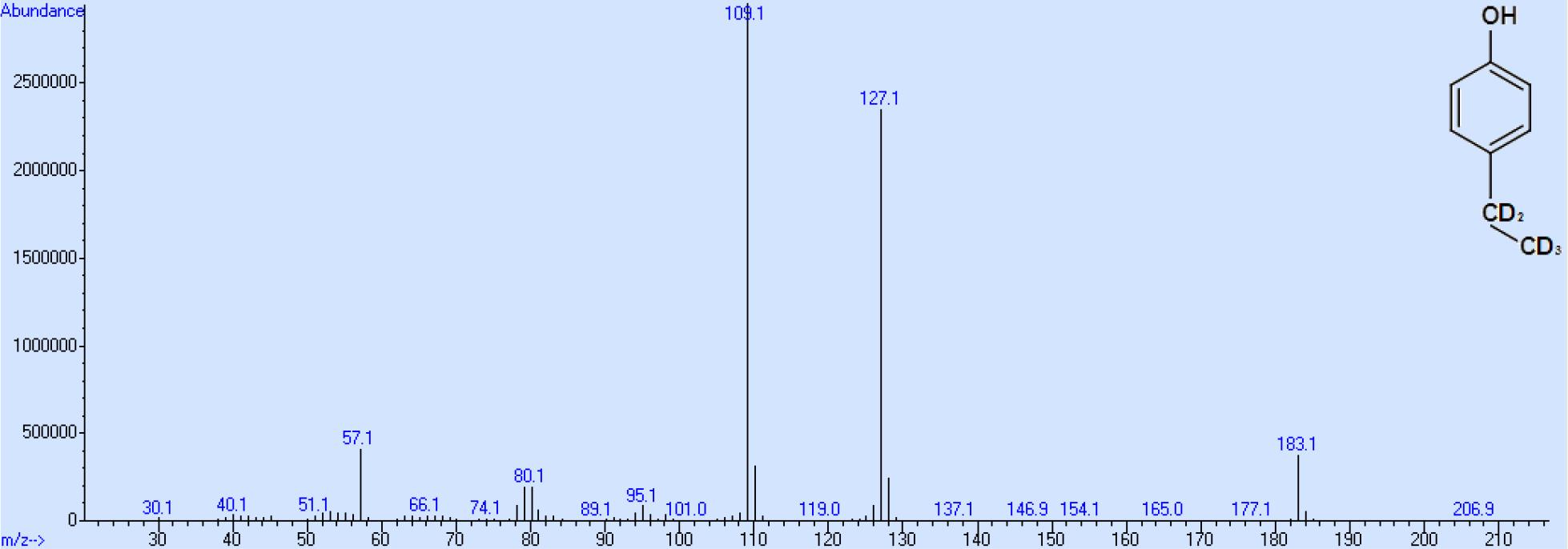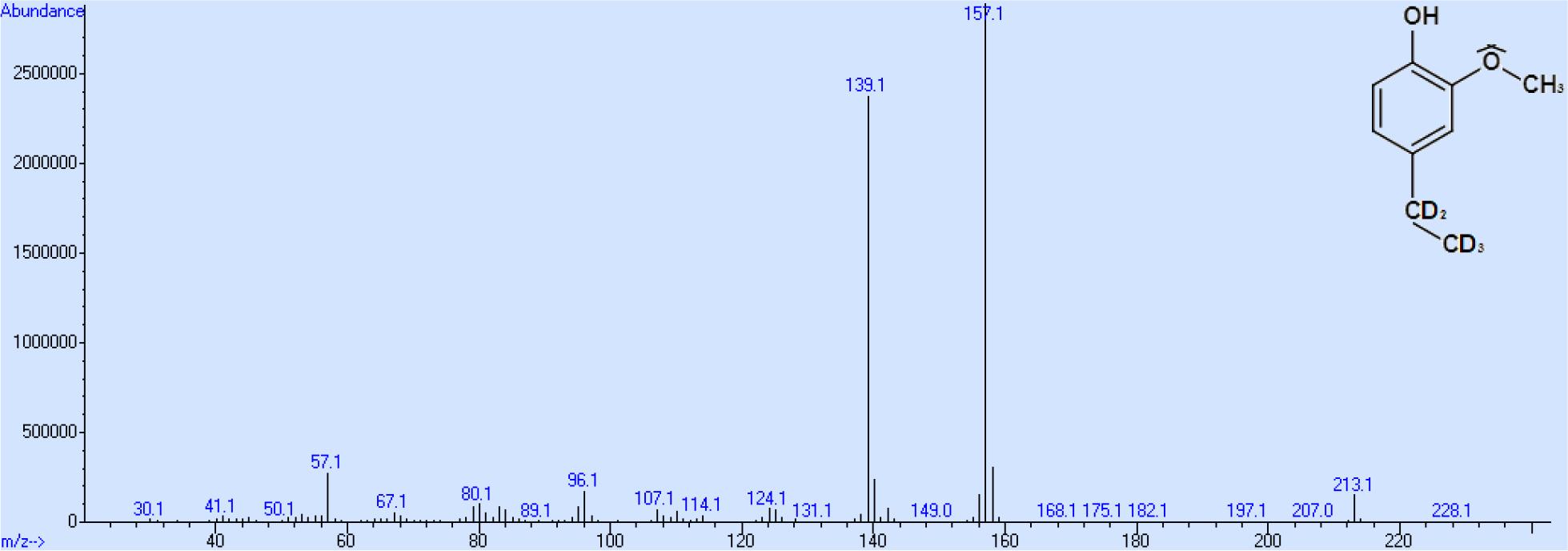 Die Gehaltsbestimmung aller drei Endprodukte erfolgte mittels HPLC durch Flächenvergleich der gemessenen Peaks mit gleichen molaren Konzentrationen der nicht deuterierten Substanzen und ergab für 4-Ethylphenol-d5 98,7 %, 4-Ethylguajacol-d5 99,3 % und 4-Ethylcatechol-d5 97,6 %. Die Massenspektren aller drei Endprodukte wurden nach Derivatisierung mit Propionsäureanhydrid auf einem Gaschromatographen mit massenspektrometrischem Detektor aufgenommen.