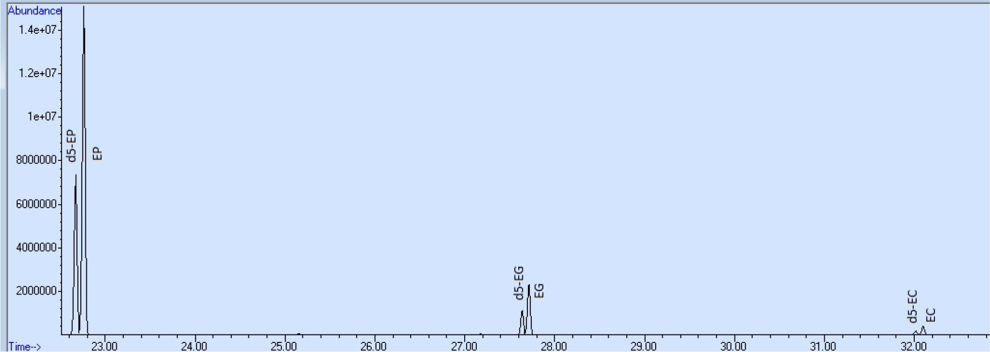 Für die quantitative Bestimmung von 4-EP, 4-EG und 4-EC in Wein wurde folgendes Derivatisierungsschema entwickelt. 10 ml Probe wurden in einem 10 ml Messkolben mit 100 μl interner Standardlösung (4-EP-d5, 4-EG-d5, 4-EC-d5 je 50 mg/l in 40 % Ethanol) gemischt. Davon wurden 3 ml in einem Zentrifugenröhrchen mit 1 g di-Kaliumhydrogenphosphat versetzt und bis zur Auflösung des Salzes mit einem Vortexmischer egalisiert. Nach Zugabe von 200 μl Propionsäureanhydrid wurde erneut ca. 1 Minute mit einem Vortexmischer egalisiert und die Lösung anschließend in ein 15ml-Vial mit Magnetrührstab geleert und sofort mittels Schraubkappe und Teflondichtung verschlossen. Die Extraktion der Analyten erfolgte 50 Minuten im Gasraum mit einer 65 μm DVB-PDMS Faser (Fa. Sigma, St. Louis, USA) bei 40° C. Die Desorption erfolgte 3 Minuten im splitless mode des GC-Injektors.