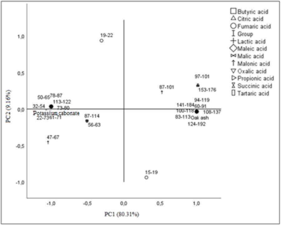 | Organic acids (ng/μL DW) | Oak Ash | Dipping solutions Potassium Carbonate | P-value |