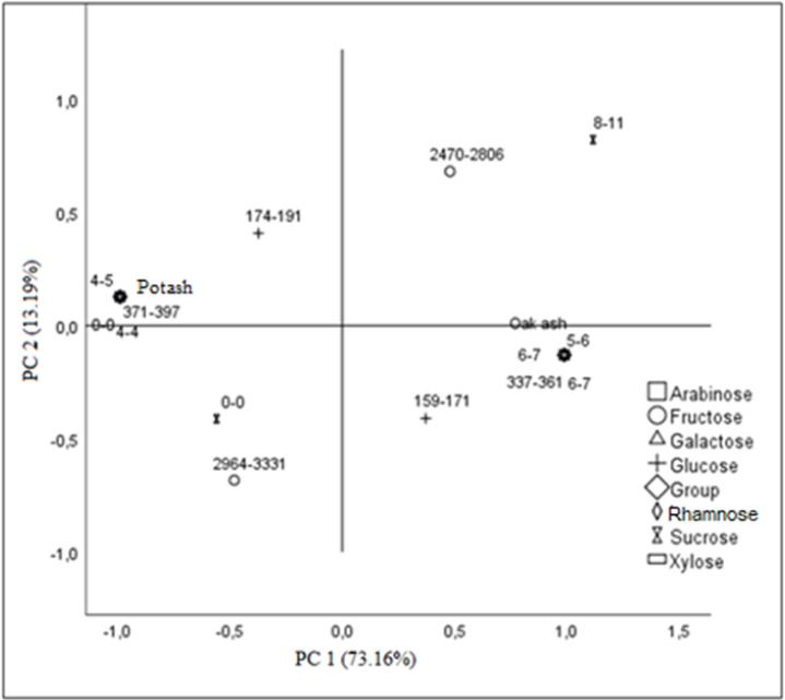 | Sugar (mg/100 g DW) | Oak Ash | Potassium Carbonate | P-value |