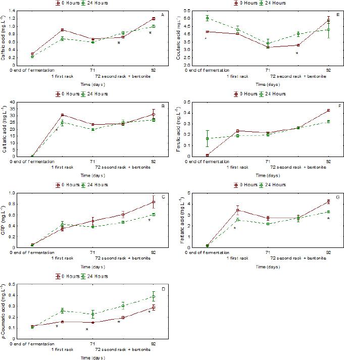 Hydroxycinnamic acid concentrations during the winemaking process: (A) caffeic acid, (B) caftaric acid, (C) GRP, (D) p-coumaric acid, (E) coutaric acid, (F) ferulic acid, (G) fertaric acid. The red line represents the whole-cluster pressing (0-hour) variant, and the green line represents the 24-hour maceration (24-hour) variant. Data are presented as means ± the sd of three replicates. Data were analysed using one-way analysis of variance (each time point separately). The average values (n = 3) were combined by contribution to homogeneous groups according to Fisher’s Least Significant Difference test, where * indicates significant differences between variants (p = 0.05).