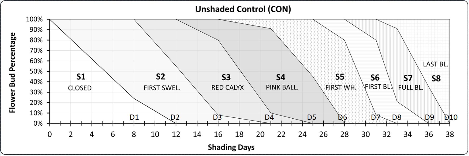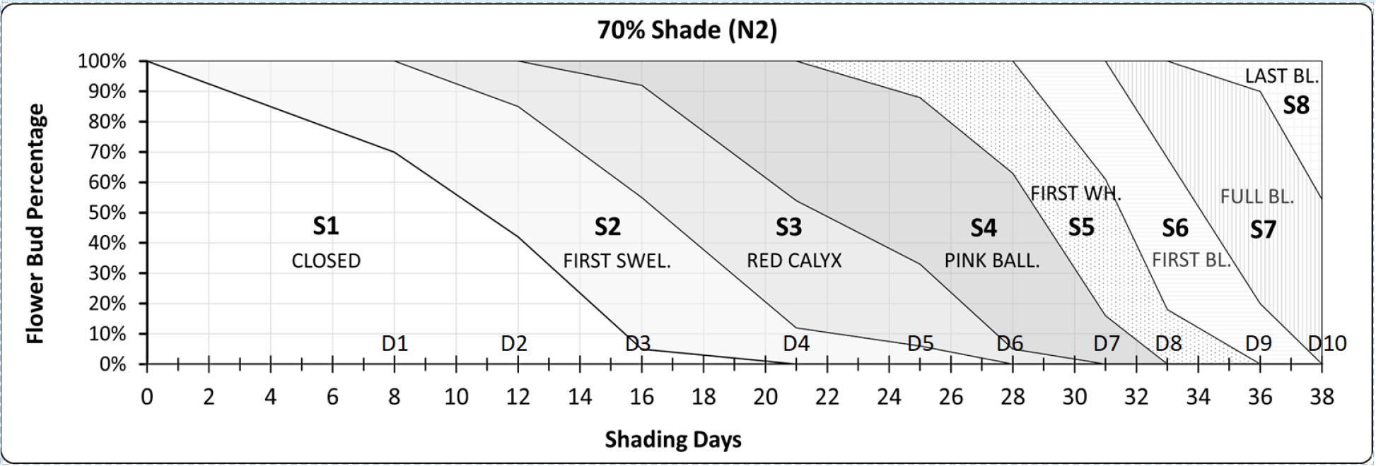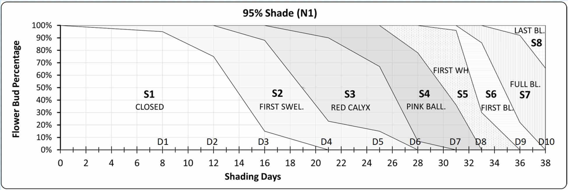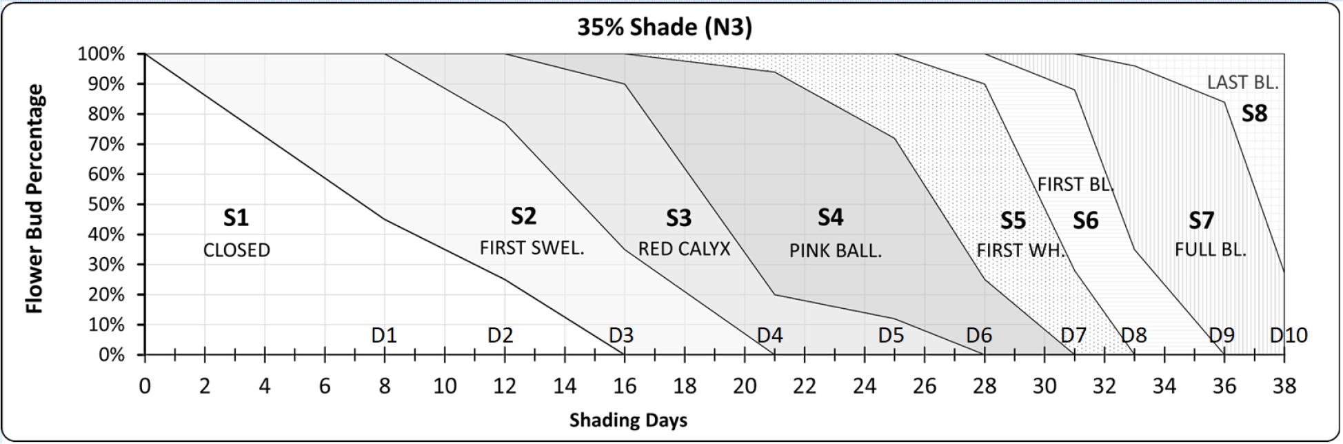| S3-Red Calyx | 95% | NR | 11 d | 67 a | 52 a | 7 a | S7-Full Bloom | 95% | NR | 14 d | 60 c | 63 a | |