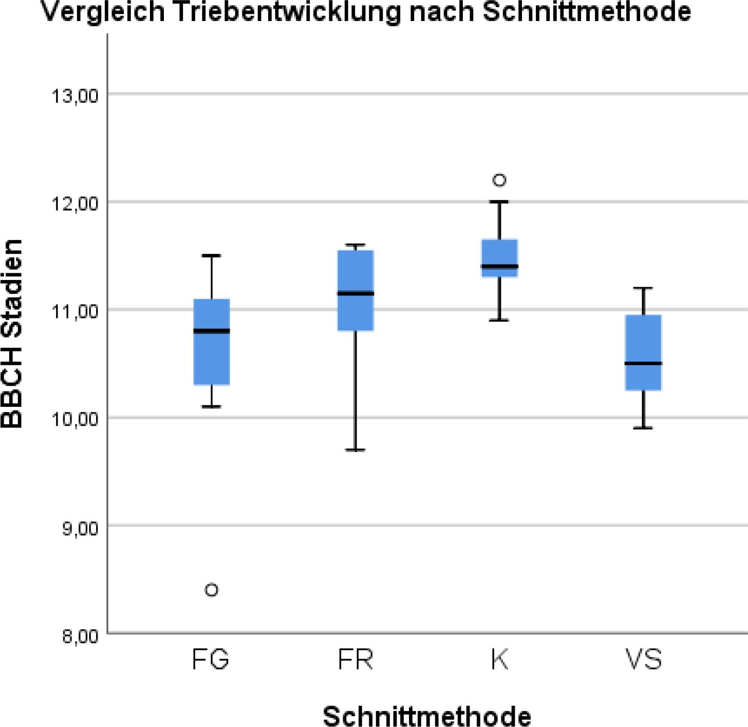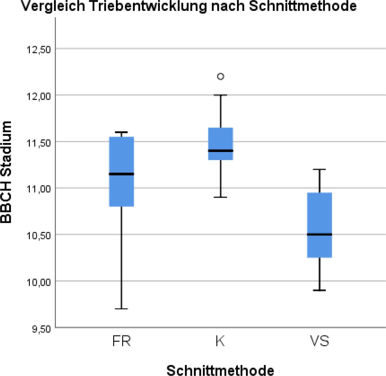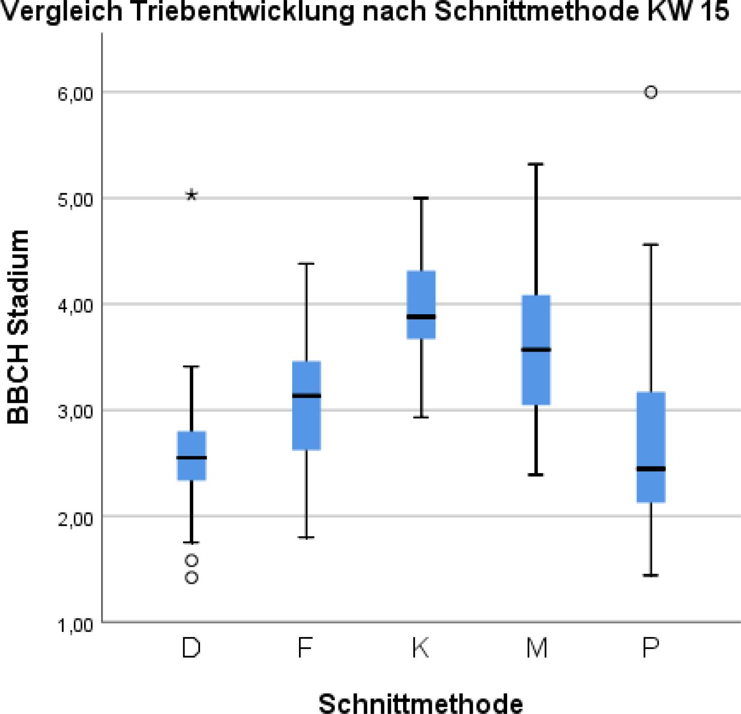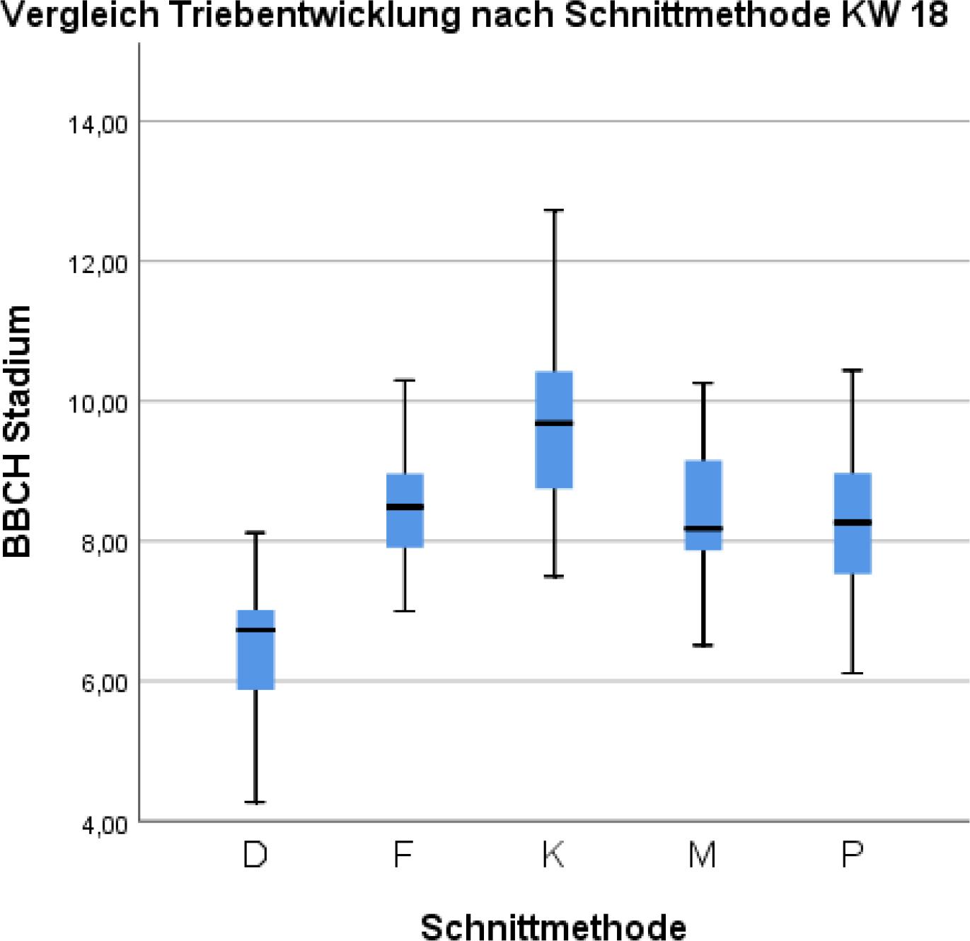 Zur Beurteilung wurden alle Knospen eines Streckers (der am Stock verbleibt) bzw. beim Minimalschnitt alle sich entwickelnden Triebe herangezogen und deren Entwicklungsstadium bestimmt. Die Werte wurden in den Wochen 11 bis 19 (teilweise auch 20.) erhoben. Zwischen den Stöcken einer Schnittvariante gab es immer Stöcke als Kontrollvariante, um den Standorteinfluss so gering wie möglich zu halten. Der durchschnittliche Wert aller Triebe eines Stockes wurde als BBCH-Stadium dargestellt. Die statistische Verrechnung erfolgte mit SSPS (IBM, Statistics 26). Die Daten wurden mittels Varianzanalyse und auf Normalverteilung überprüft. Die Mittelwerte mittels LSD-Test beurteilt (P < 0,05).Die BBCH-Stadien wurden mittels Kruskal-Wallis-Test verglichen. Die graphische Darstellung der Daten erfolgte mit den Programmen SPSS und Microsoft Excel (Microsoft Österreich GmbH, Wien, Österreich).