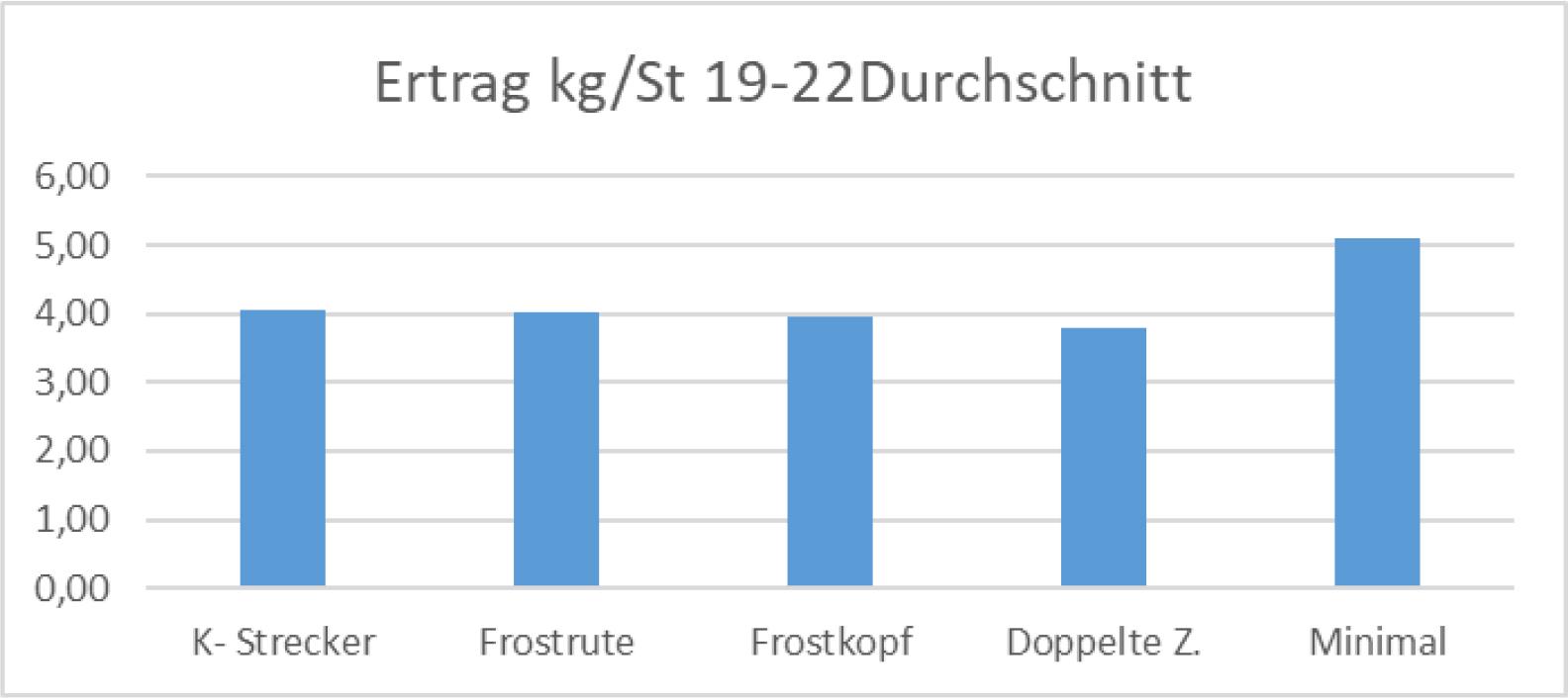 2022: Die Frostrute und der Frostkopf entwickelten sich fast im selben Tempo wie die Kontrolle. Es ergaben sich im Beobachtungszeitraum kleine Unterschiede in der Triebentwicklung, die aber nicht abgesichert werden konnten. Erst in der KW 20 (also außerhalb des eigentlichen Beobachtungszeitraumes) konnten die BBCH-Stadien mit 15:16 gegenüber der Kontrolle bestimmt werden. Die Variante Minimalschnitt verzögerte sich ab der Woche 17 gegenüber der Kontrolle, in der Woche 19 erreichte der Unterschied ein deutliches Ausmaß von BBCH 11 zu 15. Dies steigerte sich bis zur Woche 20, wo der BBCH Durchschnitt beim Minimalschnitt bei 12 und bei der Kontrolle bei 16 lag. Der doppelte Zapfenschnitt entwickelte sich bis zur Woche 15 wie die Kontrollvariante. Nach dem zweiten Schnitt ab der Woche 16 zeigte sich der Rückstand in der Entwicklung mit BBCH 5:11. Zu Beobachtungsende KW 20 war der Unterschied BBCH 12:16.