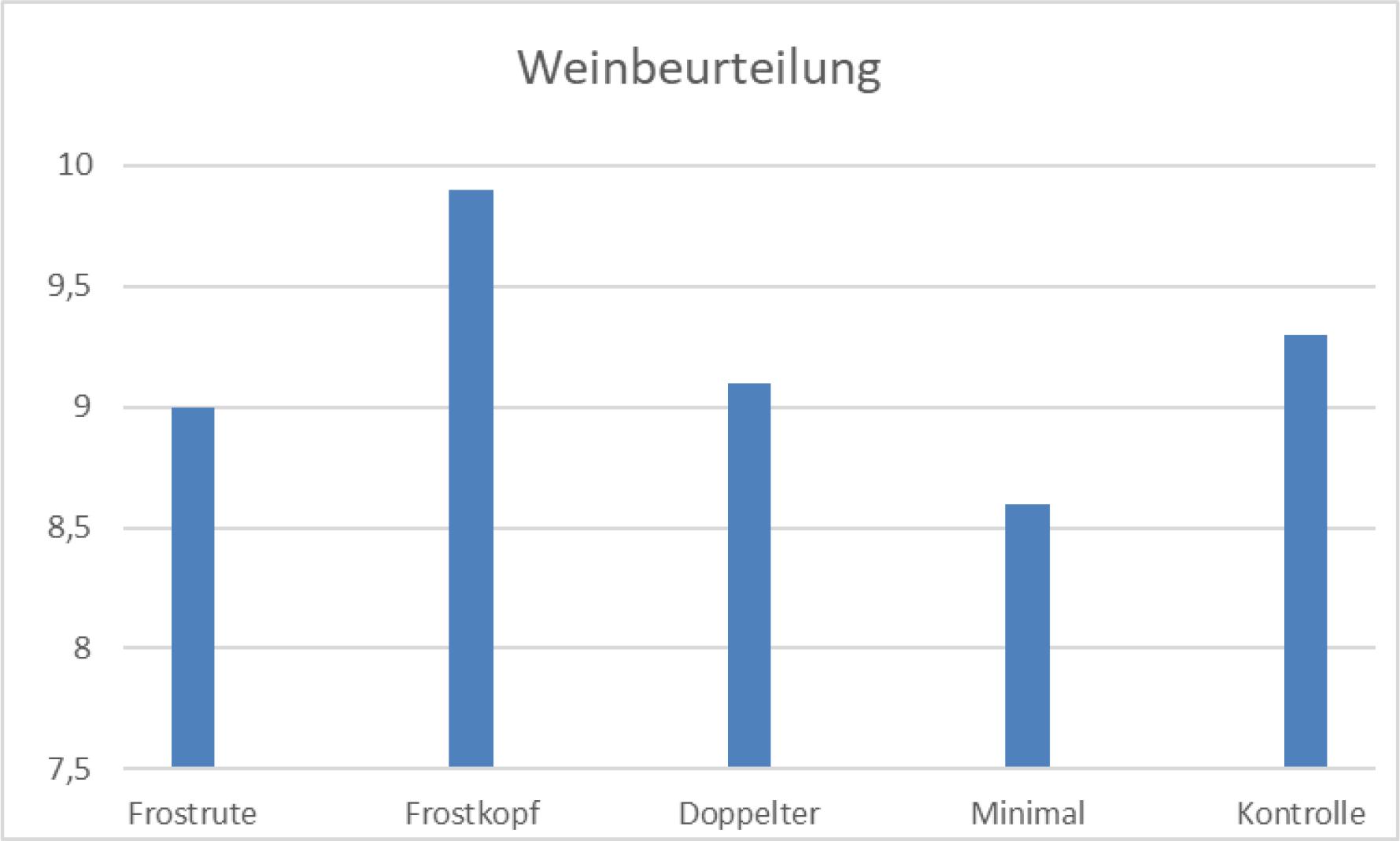 Die sensorische Bewertung aller Jahre im Durchschnitt ergab die beste Marke für die Kontrolle und ähnlich gut bewertet waren die Varianten Frostrute, Frostkopf und Doppelter Zapfenschnitt. Deutlich abgeschlagen in der Beurteilung war der Wein aus der Minimalschnitt-Variante (Abb. 8), nur dieser Unterschied konnte statistisch abgesichert (Alpha = 0,05) werden. Einzelne Jahre brachten unterschiedliche Weine zu einer Bestbewertung. So konnte 2019 der Wein von der Frostkopf-Variante als am besten beurteilter Wein erkannt werden (Abb. 9). Insgesamt erhielt der Wein des Einstrecker-Schnittes (Kontrolle) den höchsten Zuspruch.