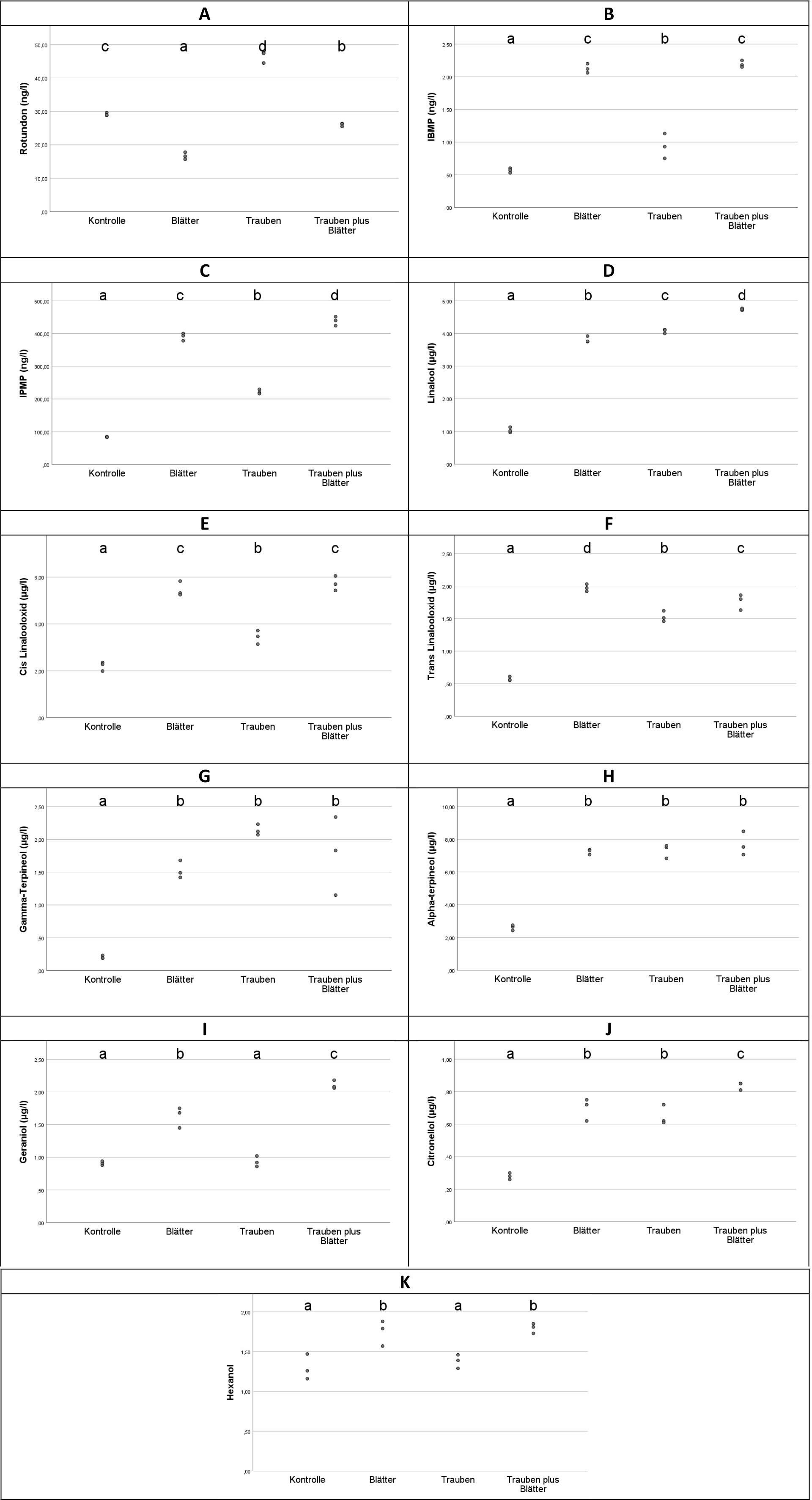 Punktdiagramme der signifikanten Primäraromen: A) Rotundon; B) 3-Isobutylmethoxypyrazine; C) 2-Isopropylmethoxypyrazine; D) Linalool; E) cis-Linalooloxid; F) trans-Linalooloxid; G) gamma-Terpeniol; H)alpha Terpeniol; I) Geraniol; J) Citronellol; K) Hexanol: Signifikanzprüfung: Tukey B-Test auf dem Signifikanz-Niveau von 0,05; Benjamin-Hochberg Korrektur, unterschiedliche Buchstaben zeigen signifikante Unterschiede