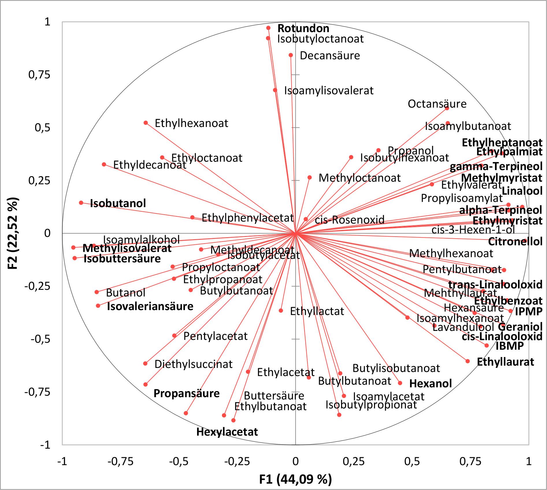 Abb. 3 ist das Ladungsdiagramm und Abb. 4 das Streudiagramm der Hauptkomponentenanalyse aller analysierten Aromastoffe zu entnehmen. Der Faktor 1 (F1) erklärt 44,09 % der Gesamtvarianz während der Faktor 2 (F2) 22,52 % zu Varianz beiträgt. Im Streudiagramm ist deutlich ersichtlich, dass sich die vier Varianten in der gesamten Zusammensetzung deutlich unterschieden. Die drei Wiederholungen der Kontrolle clusterten im negativen Bereich der x-Achse und im Mittel der y-Achse, während die beiden Varianten Blätter und Trauben vor allem durch den Faktor 2 unterscheidbar sind. Die Traubenproben clusterten im positiven Bereich der y-Achse und im Mittel der x-Achse, während die Blätterproben im negativen Bereich der y-Achse und im Mittel der x-Achse lokalisiert sind. Die Mischvariante Blätter und Trauben clusterte wie zu erwarten im positiven Bereich der x-Achse aber im Mittel der y-Achse. Die signifikanten Aromastoffe (fett gedruckt) trugen entsprechend der Erwartung am stärksten zur Streuung bei. Auffällig ist dabei die Sonderstellung von Rotundon, was eindeutig auf den Traubenzusatz zurückzuführen ist. Ein Großteil der fett gedruckten Verbindungen, die im Bereich der Varianten "Trauben und Blättern" cluster, stehen vor allem für die Unterscheidung zur Kontrollvariante, während Hexanol von den signifikanten Verbindungen am ehesten dem Blattzusatz zuzuordnen ist. Betrachtet man die Ergebnisse genauer, lässt sich ableiten, dass die Gruppe Trans-Linalooloxid, IBMP, IPMP, Geraniol, Ethylbenzoat, Ehtyllaurat Citronelool eher in dem Bereich der Blätter angesiedelt ist, während die Gruppe Ethylheptanoat, Ehtylpalmiat, gamma-Terpeniol, Linalool, alpha-Terpeniol und Methylmyristat eher im Bereich der Trauben zu finden ist. Während Isobutanol, Methylisovalerat und Isobuttersäure sowie Isovaleriansäure laut dem Ladungsdiagramm vorwiegend der Kontroll-Variante zugeordnet werden, liegen die Propionsäure und Hexylacetat im Mittel zwischen Blatt- und Kontrollvariante.