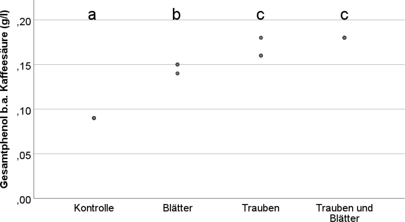 Punktdiagramme der Gesamtphenolgehalte: Signifikanzprüfung: Tukey B-Test auf dem Signifikanz-Niveau von 0,05; unterschiedliche Buchstaben zeigen signifikante Unterschiede