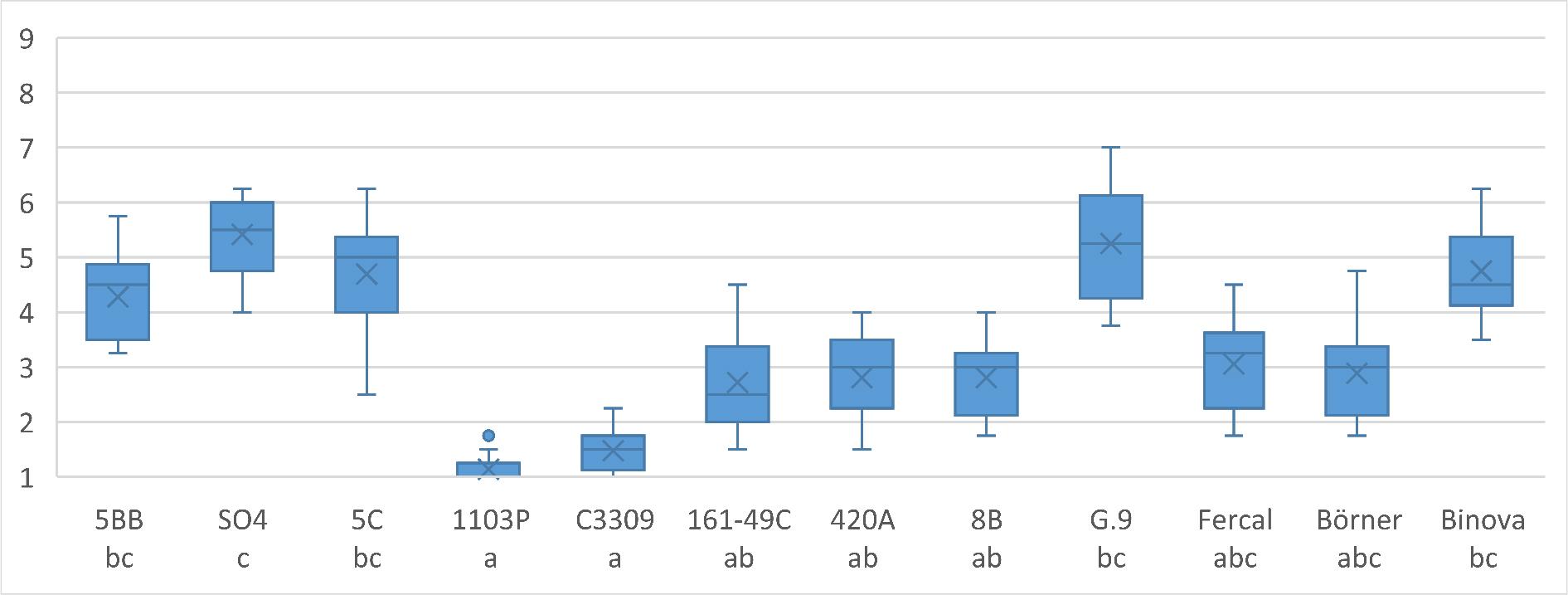Resistenz von ‘Welschriesling‘ gegen Trockenheit (Deskriptor OIV 403) in Abhängigkeit von der Unterlagsrebsorte im Jahr 2013 (Mittelwerte und Standardabweichungen; Kruskal-Wallis-Test; mehrfache Paarvergleiche mittels Dunns Prozedur / Zweiseitiger Test; Werte mit unterschiedlichen Buchstaben unterscheiden sich signifikant (p<=0,05))_