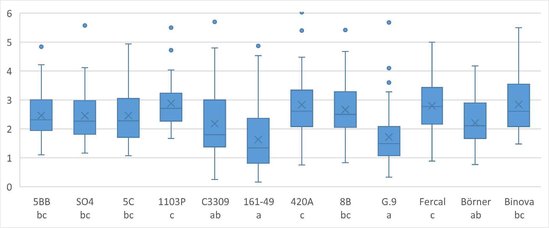 | Börner | 2,52 ab | 0,34 | 0,22 c | 0,03 | 1,13 abc | 0,11 | 1,75 cd | 0,15 | 0,13 abc | 0,01 |