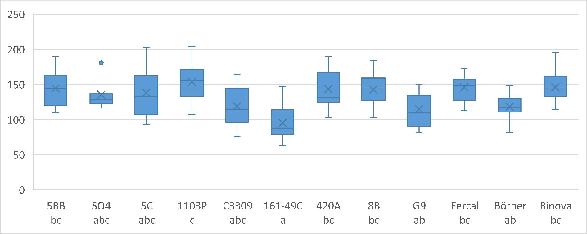 | 1103P | 2,68 ab | 0,35 | 0,30 a | 0,03 | 0,92 d | 0,09 | 2,38 a | 0,13 | 0,21 c | 0,01 |
