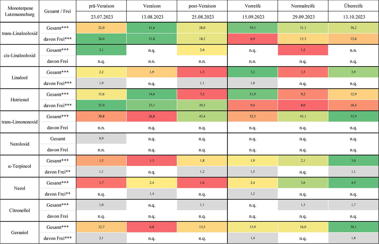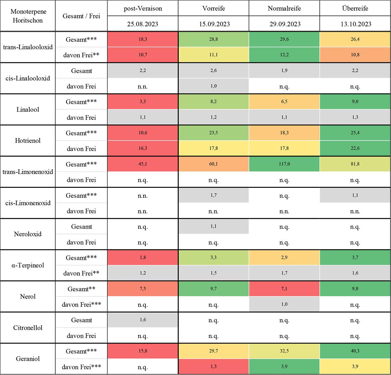 ![Konzentration [μg/kg Frischgewicht; n =3] und dynamische Entwicklung einzelner Monoterpene während der Traubenreife von Pinot Noir-Trauben am Standort Guntramsdorf, Riede Eichkogel („n.n.“ bezeichnet nicht nachweisbare Werte, während „n.q.“ für nicht quantifizierbare Werte steht. Hochsignifikante Unterschiede zwischen den Zeitpunkten sind mit *** und signifikante Unterschiede mit ** gekennzeichnet.)](https://sciendo-parsed.s3.eu-central-1.amazonaws.com/69234075a2cfbc128b1c4a62/j_mittklbg-2025-0007_fig_003.jpg?X-Amz-Algorithm=AWS4-HMAC-SHA256&X-Amz-Content-Sha256=UNSIGNED-PAYLOAD&X-Amz-Credential=ASIA6AP2G7AKL3MB22LX%2F20251215%2Feu-central-1%2Fs3%2Faws4_request&X-Amz-Date=20251215T224927Z&X-Amz-Expires=3600&X-Amz-Security-Token=IQoJb3JpZ2luX2VjEI7%2F%2F%2F%2F%2F%2F%2F%2F%2F%2FwEaDGV1LWNlbnRyYWwtMSJHMEUCIQD8WGxrtNfxZu341od%2FsrGm2xG09JV8s6kBxqoXRpgVeQIgGPJvgetUZdmHU6WDi0dh3rNFOObwwbg%2FMKtadkbT%2Fa8qvAUIVxACGgw5NjMxMzQyODk5NDAiDCH2FLfB1suC370JsSqZBZ4DC6trXGvrfBw%2F%2BgeXfHZp5xwREribyX59OGZ5B64IJ0SmFeBGrD4yVmxttUZ%2B2mxgCq9HRzkRhPop5Uap2hvjSG4Cgl3dL0j0cjb6rJrOITiEY6BVhNXEYXe7LX7%2FD7lKb4cdfbSBwIysc5AjlaVyPoTCcBX1bzTnXvE1XGwK4LgiQzyEY1LUEbE12pC4dS1UczR37Izw8aCsR0U7aBWAEe0jOSz2uQrxCXAH5HjEmeYE08nZu79e%2FePalAlVboM1hQeK4tIczRocvkkEpHtOGw8S5ZF7jOWTC2XKIC6yrSf4KVpeeyMqUN%2BSqvu70pgbXip%2BK20UF0ftw%2FPFh87E1qfGE5p3tuVHiZil7hQymx3vSXBSrYydXAmG8g5b%2Bs2XO4fQirIx%2FQza5wJTN2us8emMg9wgCiuV3ZgmYnjvujKvS2q%2B5xgjKTh0MGkwTs1hB7fN5CJXF7JVzy5xacTnI7hOu%2B2HZE10TAQfWBMUrJcSoVF2WmvhAKvTSWolwa7nw6lUwVMSjb50mPTIjBOT51gJysa9sFn%2BwLNBAyCSheUE4zCwIyc9fWuskxzsMDR7yEZg%2B7Ue4AhvZq3QWhBj2wEXxuL6mPN2zWs73nFcb8MOdKq6G840831S9FQ6GcnIQRBt%2ByJtYUeTd2ZBoGnpoik%2Ff6N0YdWc2gPFoKFlj6relz80CkznfXxH3UQk67qkA6KUgktMs8Pw7cZSh8Q%2B9SNWScQmM7Y6rqUZC2%2FZRhrkQ4yPn42tNYc%2F6cYnCkXFSyRueBJLlDWOSvEtA0hngLaGYAxgMpLfL23pixqC74vsXL5IFdN3yPfhV1nGn2snpeWvJwFtUpb%2FkEfo9je3xvjvAoUOcP3zs6MaFPUqfmISNPisOS69MO2NgsoGOrEBayWCTRAtyfQ15vXUhCeN875%2FPDb4DZ2yIIA9kvxf8WNL4lSqbmcioA0elRdKNSTJdnOLhKXu3eCg04DsOF6YKxB0F4C8jt8GGPwq82bBL4FTJrWFaUc%2FgUR1l%2BDRL8EJXU0oZxlyc5yawHKSBtIGkmCrKxpoA8sn33JN%2FiXBWaMQBA3Dqor6nQ%2FmC0XrdrB0%2FQK49JVOagybqOxn8VwgdoxOqju4HwdGQ15LcsyKoynd&X-Amz-Signature=922273107c7bc7d1384b34697e46814445bcd46772d0e6fdb8f44545af23a2a1&X-Amz-SignedHeaders=host&x-amz-checksum-mode=ENABLED&x-id=GetObject)
