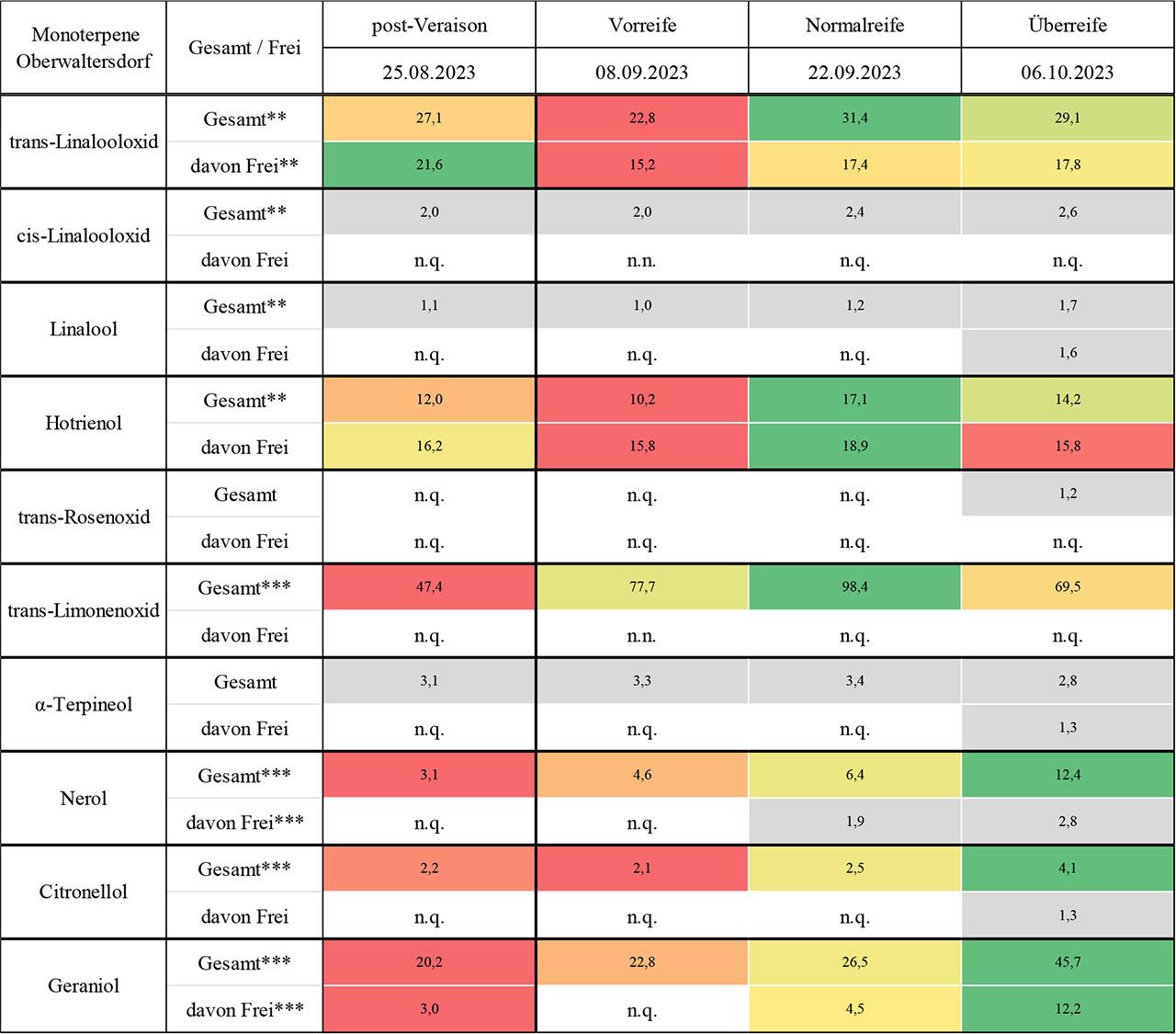 ![Konzentration [μg/kg Frischgewicht; n =3] und dynamische Entwicklung einzelner Monoterpene während der Traubenreife von Pinot Noir-Trauben am Standort Oberwaltersdorf, Riede Kräutergarten („n.n.“ bezeichnet nicht nachweisbare Werte, während „n.q.“ für nicht quantifizierbare Werte steht. Hochsignifikante Unterschiede zwischen den Zeitpunkten sind mit *** und signifikante Unterschiede mit ** gekennzeichnet.)](https://sciendo-parsed.s3.eu-central-1.amazonaws.com/69234075a2cfbc128b1c4a62/j_mittklbg-2025-0007_fig_004.jpg?X-Amz-Algorithm=AWS4-HMAC-SHA256&X-Amz-Content-Sha256=UNSIGNED-PAYLOAD&X-Amz-Credential=ASIA6AP2G7AKL3MB22LX%2F20251215%2Feu-central-1%2Fs3%2Faws4_request&X-Amz-Date=20251215T224927Z&X-Amz-Expires=3600&X-Amz-Security-Token=IQoJb3JpZ2luX2VjEI7%2F%2F%2F%2F%2F%2F%2F%2F%2F%2FwEaDGV1LWNlbnRyYWwtMSJHMEUCIQD8WGxrtNfxZu341od%2FsrGm2xG09JV8s6kBxqoXRpgVeQIgGPJvgetUZdmHU6WDi0dh3rNFOObwwbg%2FMKtadkbT%2Fa8qvAUIVxACGgw5NjMxMzQyODk5NDAiDCH2FLfB1suC370JsSqZBZ4DC6trXGvrfBw%2F%2BgeXfHZp5xwREribyX59OGZ5B64IJ0SmFeBGrD4yVmxttUZ%2B2mxgCq9HRzkRhPop5Uap2hvjSG4Cgl3dL0j0cjb6rJrOITiEY6BVhNXEYXe7LX7%2FD7lKb4cdfbSBwIysc5AjlaVyPoTCcBX1bzTnXvE1XGwK4LgiQzyEY1LUEbE12pC4dS1UczR37Izw8aCsR0U7aBWAEe0jOSz2uQrxCXAH5HjEmeYE08nZu79e%2FePalAlVboM1hQeK4tIczRocvkkEpHtOGw8S5ZF7jOWTC2XKIC6yrSf4KVpeeyMqUN%2BSqvu70pgbXip%2BK20UF0ftw%2FPFh87E1qfGE5p3tuVHiZil7hQymx3vSXBSrYydXAmG8g5b%2Bs2XO4fQirIx%2FQza5wJTN2us8emMg9wgCiuV3ZgmYnjvujKvS2q%2B5xgjKTh0MGkwTs1hB7fN5CJXF7JVzy5xacTnI7hOu%2B2HZE10TAQfWBMUrJcSoVF2WmvhAKvTSWolwa7nw6lUwVMSjb50mPTIjBOT51gJysa9sFn%2BwLNBAyCSheUE4zCwIyc9fWuskxzsMDR7yEZg%2B7Ue4AhvZq3QWhBj2wEXxuL6mPN2zWs73nFcb8MOdKq6G840831S9FQ6GcnIQRBt%2ByJtYUeTd2ZBoGnpoik%2Ff6N0YdWc2gPFoKFlj6relz80CkznfXxH3UQk67qkA6KUgktMs8Pw7cZSh8Q%2B9SNWScQmM7Y6rqUZC2%2FZRhrkQ4yPn42tNYc%2F6cYnCkXFSyRueBJLlDWOSvEtA0hngLaGYAxgMpLfL23pixqC74vsXL5IFdN3yPfhV1nGn2snpeWvJwFtUpb%2FkEfo9je3xvjvAoUOcP3zs6MaFPUqfmISNPisOS69MO2NgsoGOrEBayWCTRAtyfQ15vXUhCeN875%2FPDb4DZ2yIIA9kvxf8WNL4lSqbmcioA0elRdKNSTJdnOLhKXu3eCg04DsOF6YKxB0F4C8jt8GGPwq82bBL4FTJrWFaUc%2FgUR1l%2BDRL8EJXU0oZxlyc5yawHKSBtIGkmCrKxpoA8sn33JN%2FiXBWaMQBA3Dqor6nQ%2FmC0XrdrB0%2FQK49JVOagybqOxn8VwgdoxOqju4HwdGQ15LcsyKoynd&X-Amz-Signature=40684430c0d34f91fed0c356823872e571be5d5d4d2e8d8282fe5bec0eda4654&X-Amz-SignedHeaders=host&x-amz-checksum-mode=ENABLED&x-id=GetObject)