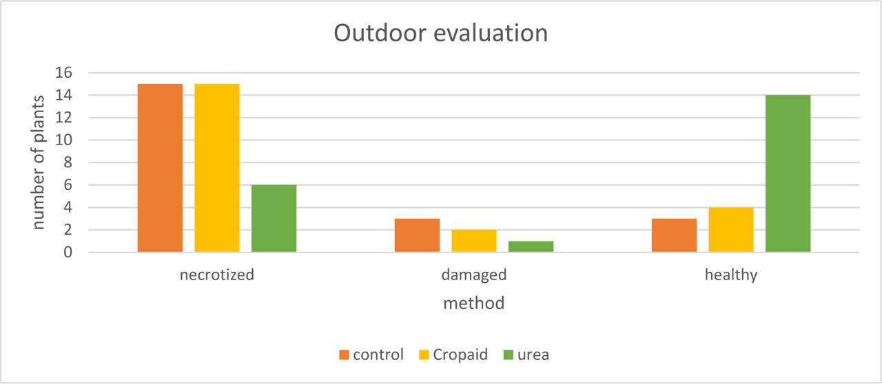 The difference between Urea (U; 2%) and both the control (C) and Cropaid (K; 0,5%) was significant