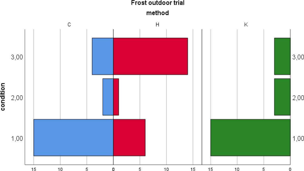 Results gained by incubation with the frost chamber after a twice spray treatment_ The differences were not significant_ Number of pots for each classification_