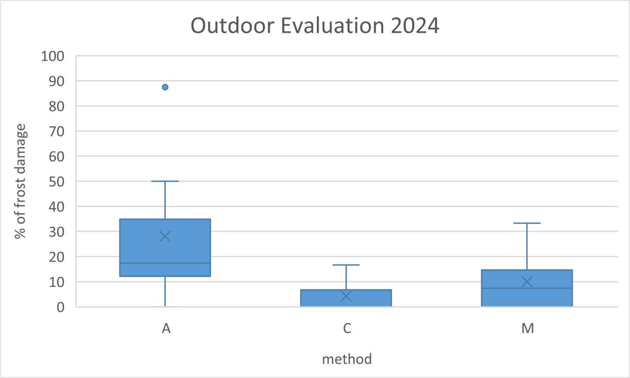 Incidence and severity of frost damage on shoots at a vineyard in Krems_ Statistical analysis was done with Kruskal Wallis Test_ Different superscript letters represent significant differences_