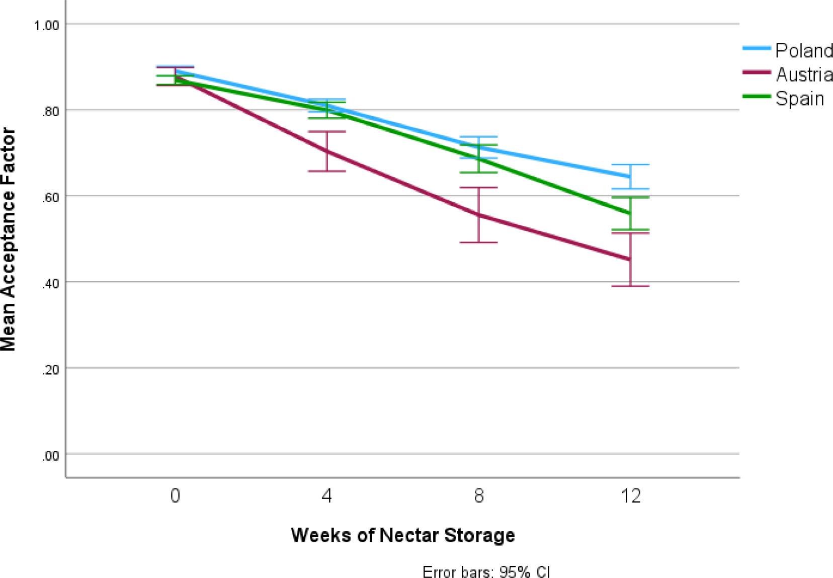 The mean and standard deviation of the Acceptance Factor (AF) on day of production and after 4, 8 and 12 weeks (AF0, AF4, AF8 and AF12 respectively) and the difference between AF0 and the Acceptance Factor at these points in time (D4, D8 and D12) of nectars produced from strawberries from different countries, and the mean and standard deviation of the total monomeric anthocyanin content expressed in pelargonidin-3-O-glucoside of these nectars_ Lower case letters denote significant differences (p < 0_05)_