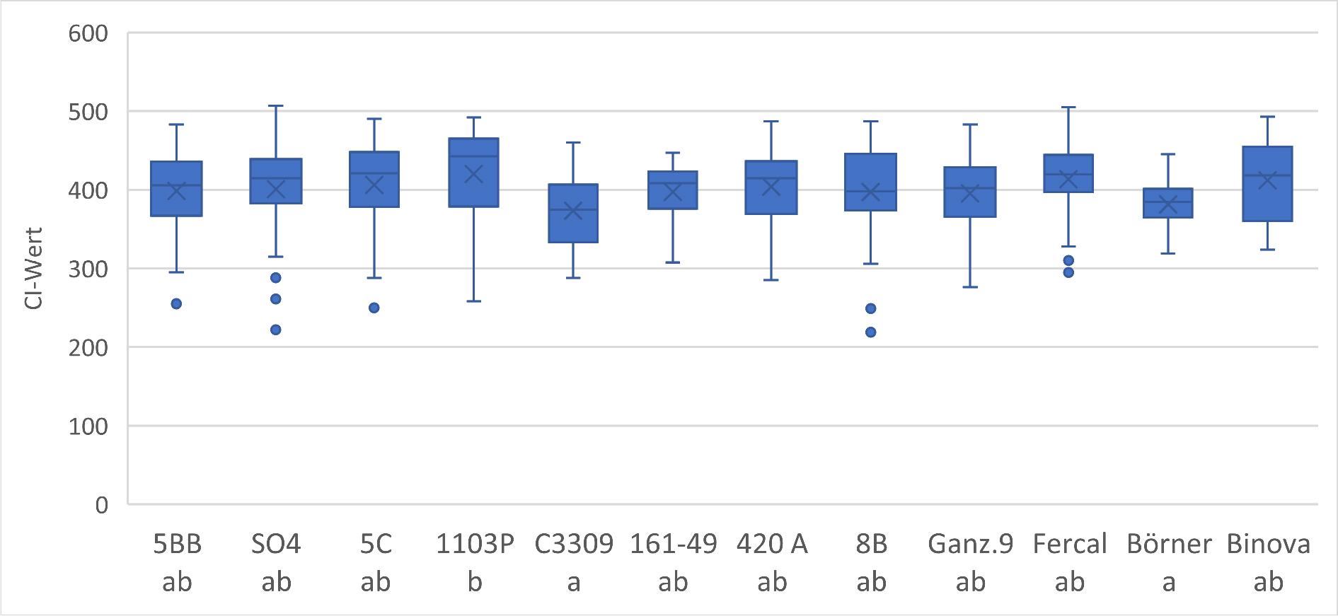 | 420A | 30,2a ± 13,5 | 47,0a ± 13,5 | 7,53cd ± 1,6 | 22,7ab ± 1,3 | 71,8a ± 13,2 |