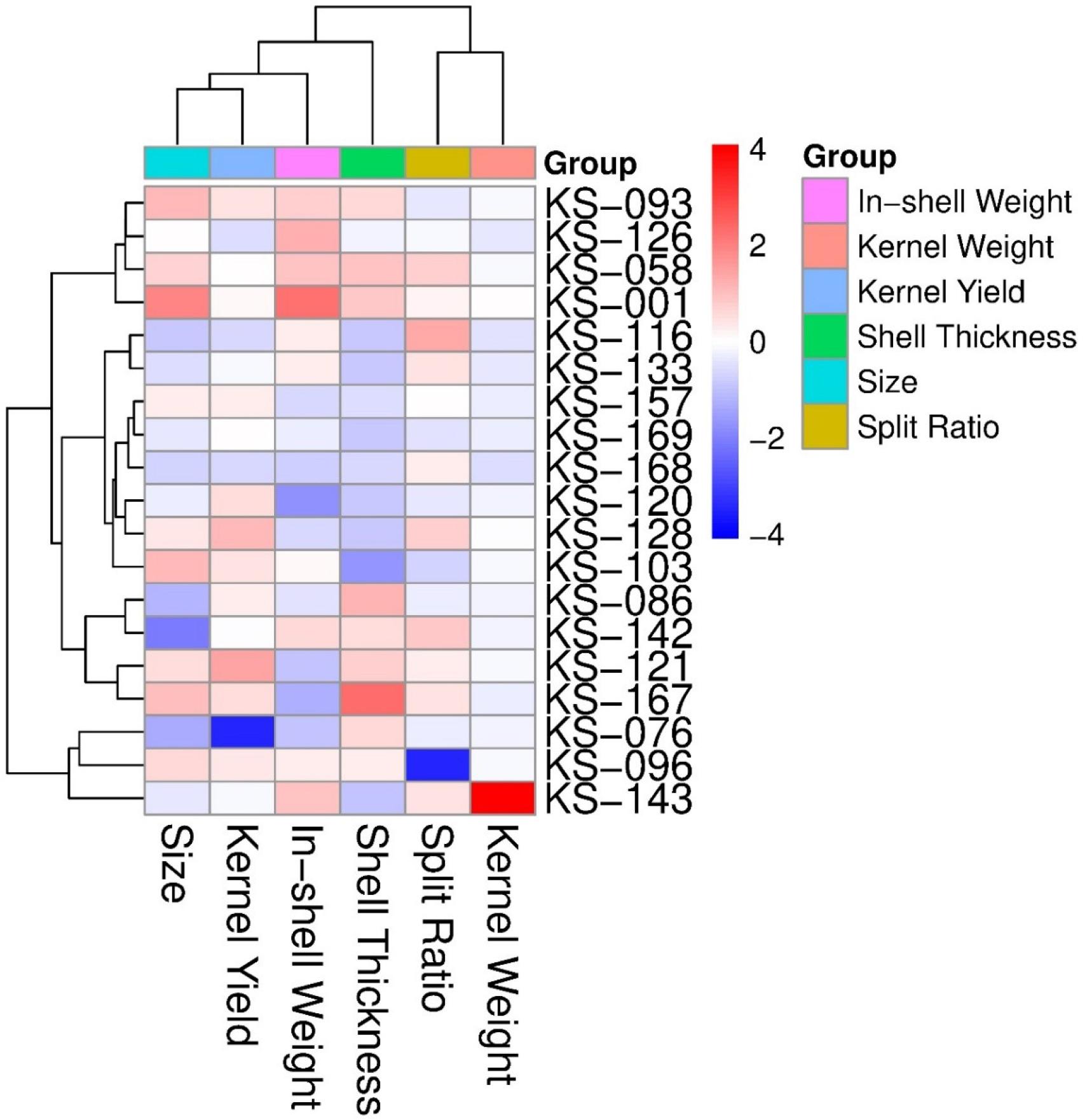| Genotypes | CPI | Rank | Size | In-shell Weight | Split Ratio | Shell-Thickness | Kernel Yield | Selection Reason | Group |