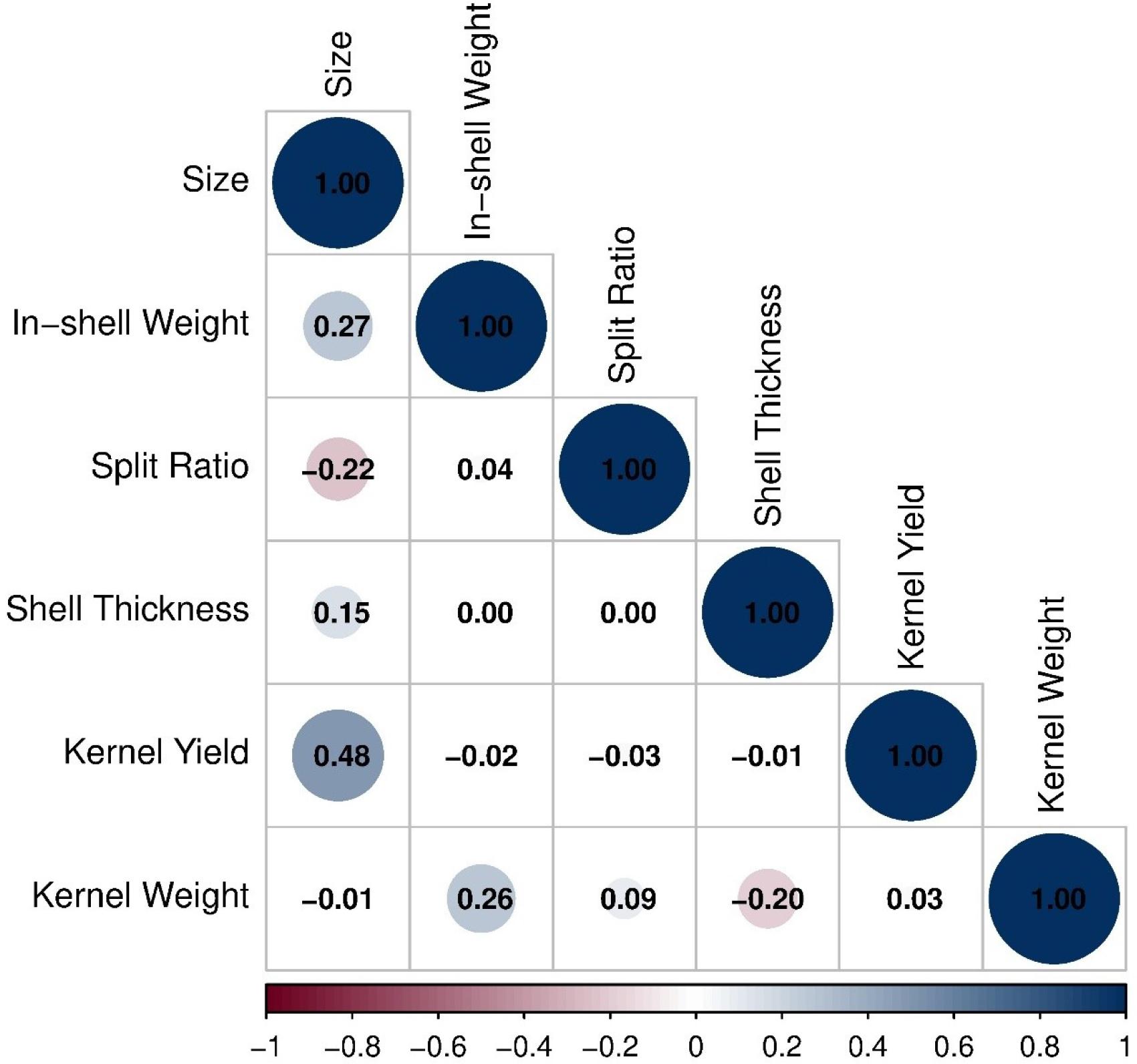 | Genotype | Size (cm) | In-shell Weight (g) | Split Ratio (%) | Shell Thickness (mm) | Kernel Yield (%) | Kernel Weight (g) |