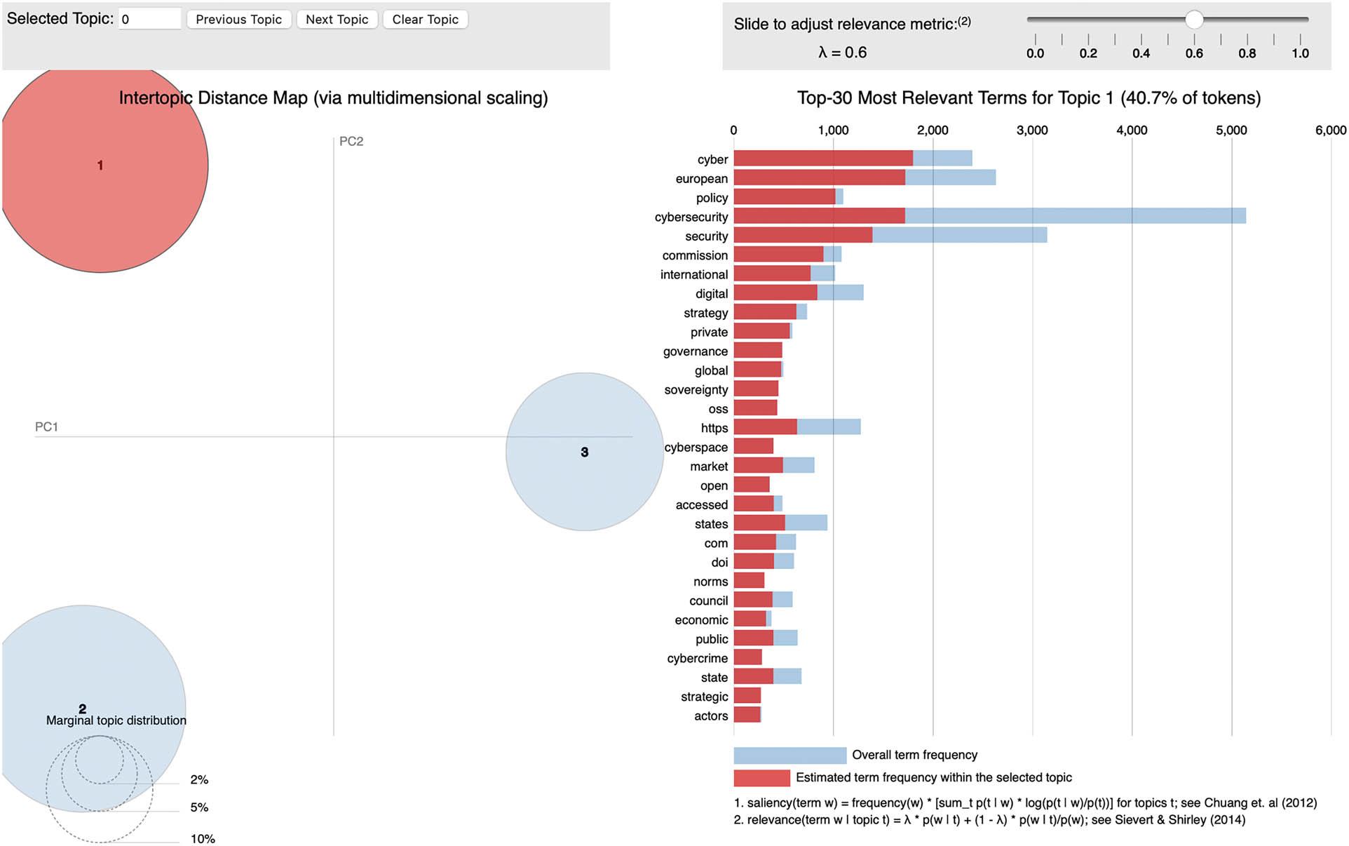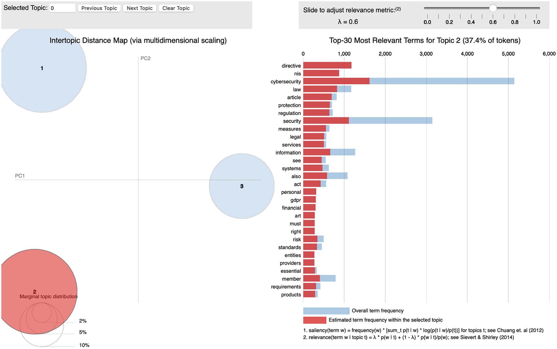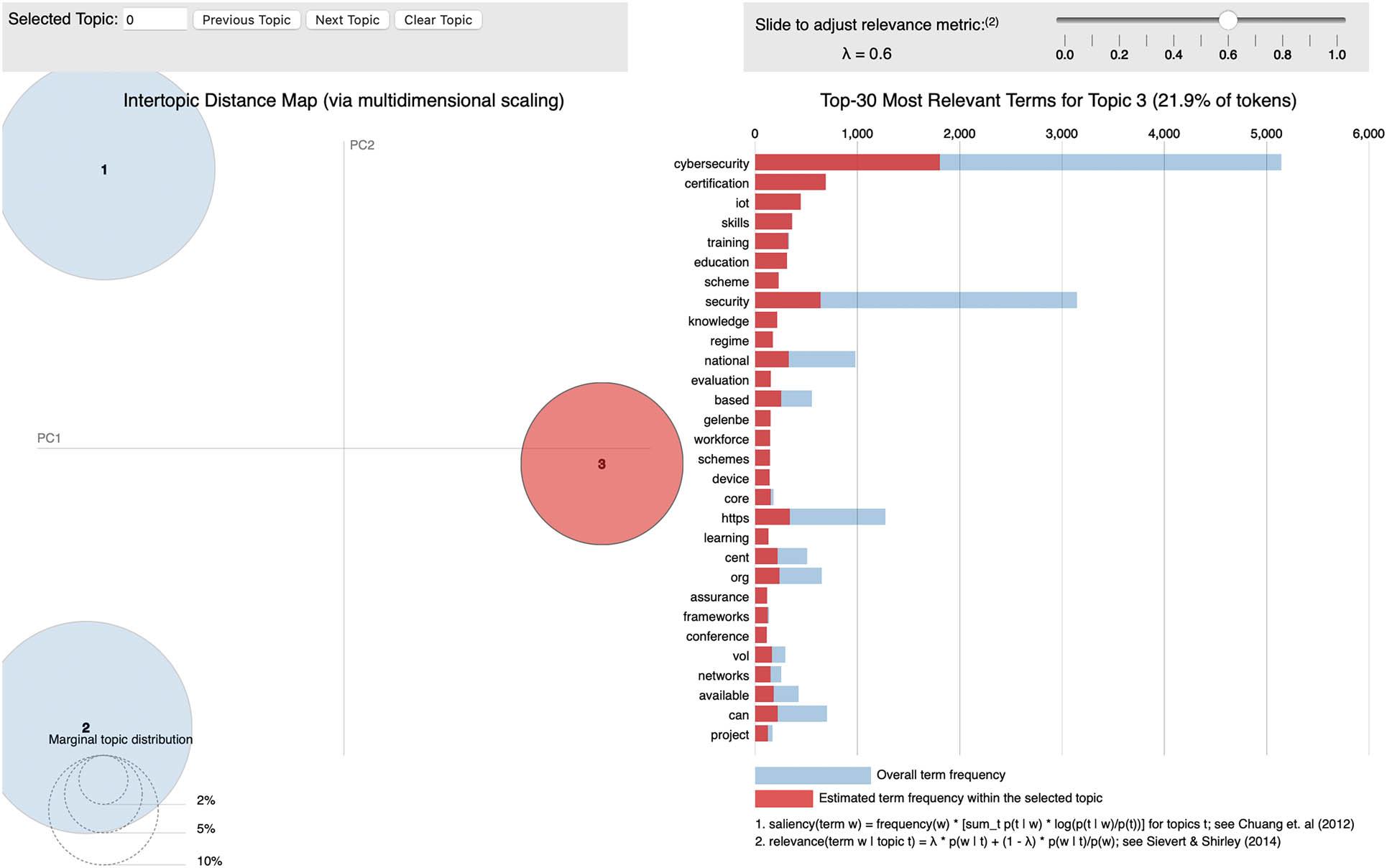 The LDAvis visualization supported the thematic distinctiveness of these topics by showing relatively well-separated topic clusters in two-dimensional space. Adjusting the lambda parameter was particularly useful in distinguishing general-purpose terms (e.g., “cybersecurity”) from terms uniquely tied to specific themes.