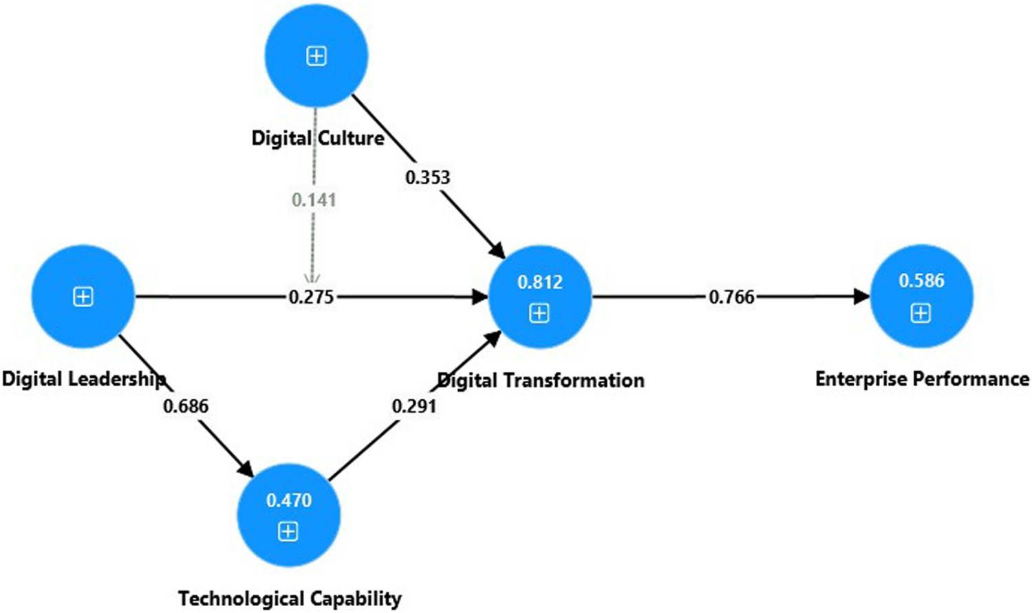 DIGIC – Digital Culture; DIGIL – Digital leadership; DIGIT – Digital Transformation; ENTP – Firm Performance; TECH – Technological Capability.