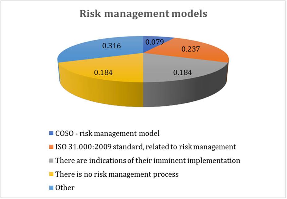 In the third section of the questionnaire, questions related to the data and attitudes of respondents about risk management in their organization were processed. Based on the answers to the first question, it was concluded that 7.9% of the organizations apply the COSO model of risk management, 23.7% apply the ISO 31.000:2009 Standard, and 31.6% of organizations apply some other models, which do not belong to standard solutions in this area. In 18.4% of the cases, respondents indicated that there are indications of their imminent implementation, while in the same percentage, there is no risk management process. The answers to this question are presented in Figure 1.