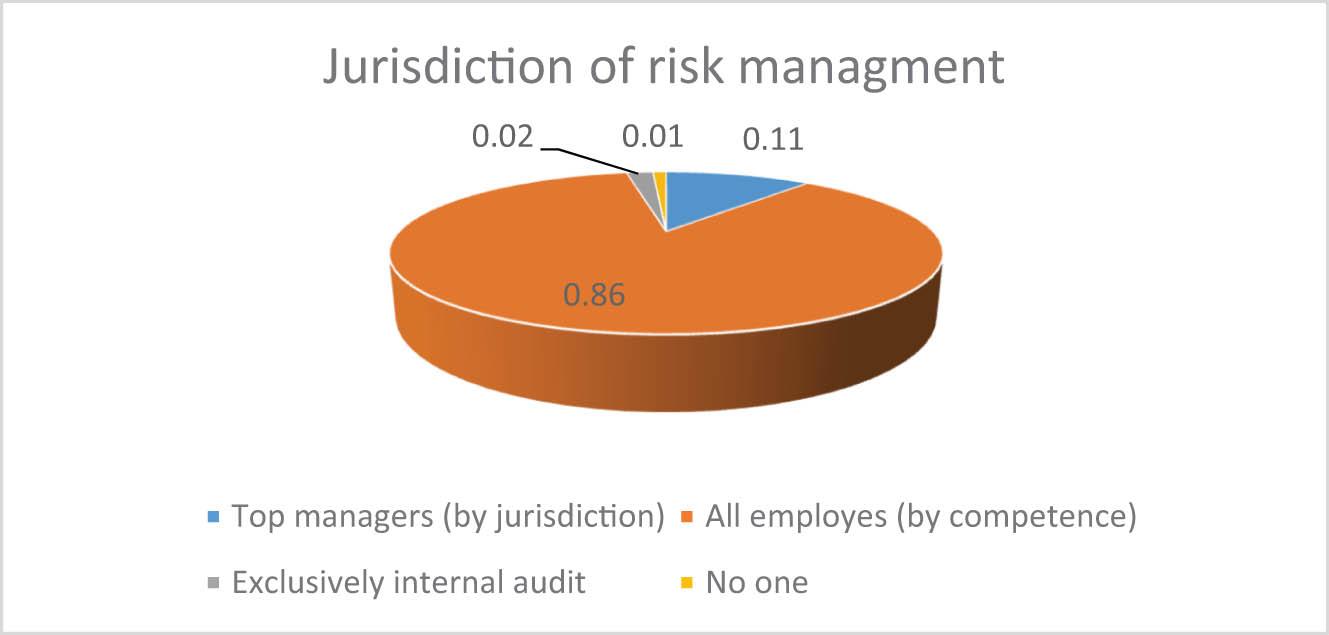 Figure 2 shows data on the persons responsible for risk management in the organization, and the largest number (86.0%) is all employees, depending on the responsibilities they perform in the organization, followed by top managers (11.0%), also depending on the competence, and in a much smaller number of internal audits (2%) or not implemented (1%).