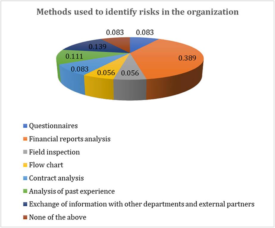 There is considerable dispersion in the sample and in the methods used to identify risks in the organization. Of the total number of respondents, 38.9% stated that their organization uses the analysis of financial reports, 13.9% exchange information with other departments and external partners, and 8.6% each stated that it is done through a questionnaire, by analyzing the contract or not at all. The analysis of experience is used in the case of 11.1% of the organizations, and 5.6% each use a field survey and a flow chart. The data are shown in Figure 3.