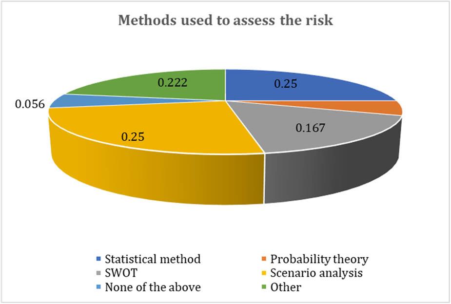 The methods used for risk assessment are also varied. Of the total number of respondents, 25% stated that statistical methods are used in their organization to assess the intensity and effects, as well as the frequency of risks, 5.6% probability theory, 16.7% strengths, weaknesses, opportunities, threats (SWOT) analysis, 25% scenario analysis, and 22.2% of other analyses not specified in the survey. Analyzing the data in Figure 4, we observe that 5.6% of the organizations do not use any of the above methods for assessing the intensity and frequency of risks.