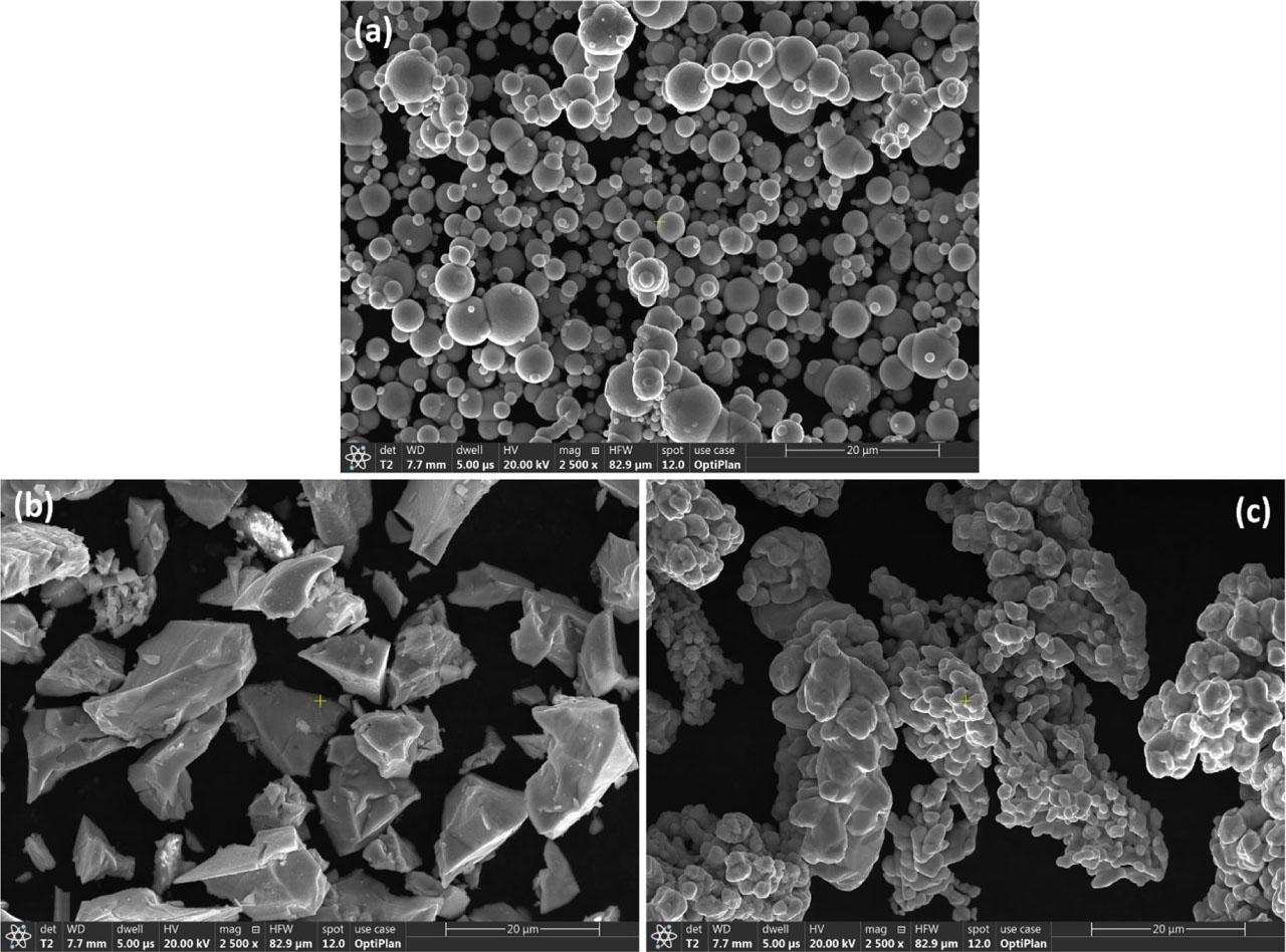 SEIs of the size and shape of the selected processed alloy powders: (A) BD5-1; (B) BD5-3; and (C) BD5-4 alloys. SEI, secondary electron image