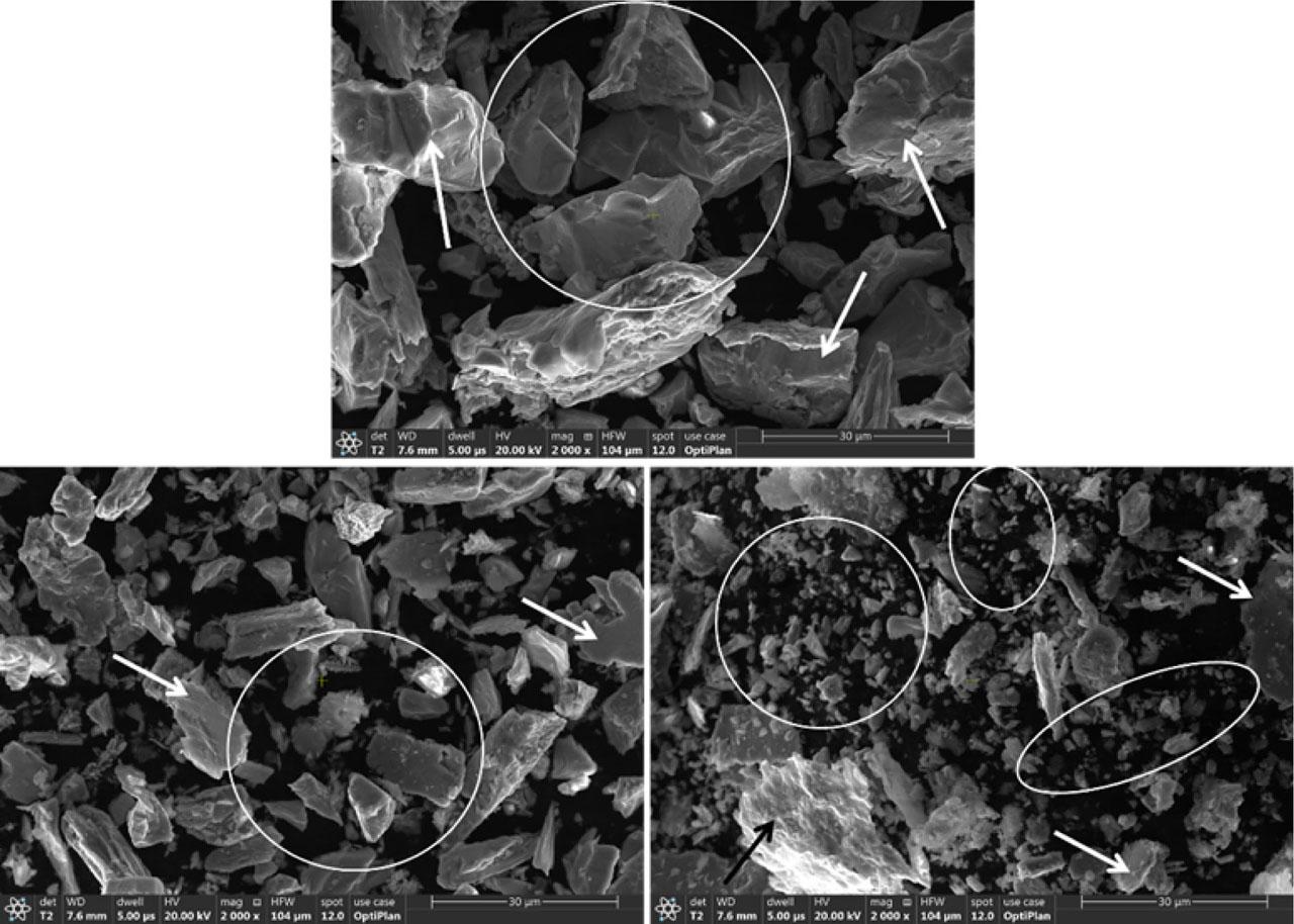 Figure 2 shows the SEIs of three selected samples to illustrate the effect of BPMR and MT, as examples, on the size and morphology of the processed alloy powders. Figure 2A displays the BD5-1 alloy with processing conditions of 5 wt%Cu, 1 h MT, 200 rev/min MS, and 5:1 BPMR. Figure 2B exhibits the processed powders of BD5-3 alloy with input parameters of 5 wt% Cu, 1 h MT, 200 rev/min MS, and 15:1 BPMR. Figure 2C reveals the processed powders of BD5-4 alloy with conditions of 5 wt% Cu, 10 h MT, 200 rev/min MS, and 15:1 BPMR. It is obvious from these images that on increasing the BPMR (BD5-1 vs. BD5-3 samples), the powder particles in Figure 2B became more refined (the circled regions) and flattened (arrowed), compared with the particles in Figure 2A. Furthermore, increasing the MT (BD5-3 vs. BD5-4 samples), the powder particles in Figure 2C displayed a large decrease in the particle size, as seen in the circled regions, and an additional flattening in the particles’ shape, as seen in the arrowed particles. Increasing MT and/or BPMR resulted in more energy input during the milling process, which applied more collision action inside the milling vails and produced finer powders, as shown in Figure 2C.