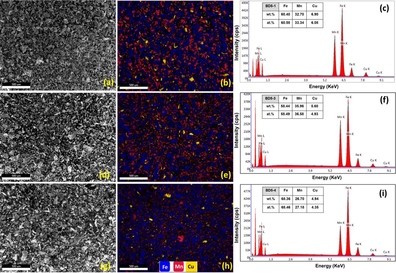 Figure 3 presents the results of the EDS analysis of the same selected alloys (BD5-1, BD5-3, and BD5-4). Figures 3A, 3D, and 3G show the SEIs for the BD5-1, BD5-3, and BD5-4 alloys, respectively. Figures 3B, 3E, and 3H show the elemental maps for the BD5-1, BD5-3, and BD5-4 alloys, respectively; these maps are in full agreement with the results shown in Figure 2. The EDS spectra in Figures 3C, 3F, and 3I confirm the alloys’ chemical composition. Increasing BPMR from 5:1 in the BD5-1 alloy – shown in Figures 3A and 3B – to 15:1 in the BD5-3 alloy – shown in Figures 3D and 3E – was observed to improve the elemental dispersion, with a notable refining in the metal particles. Moreover, increasing the MT from 1 h in BD5-3 alloy (illustrated in Figures 3D and 3E) to 10 h in BD5-4 alloy (shown in Figures 3G and 3H) resulted in an additional refining of the powder particles and improved the elemental dispersion with a notable flattening/deformation of Fe particles due to milling action.