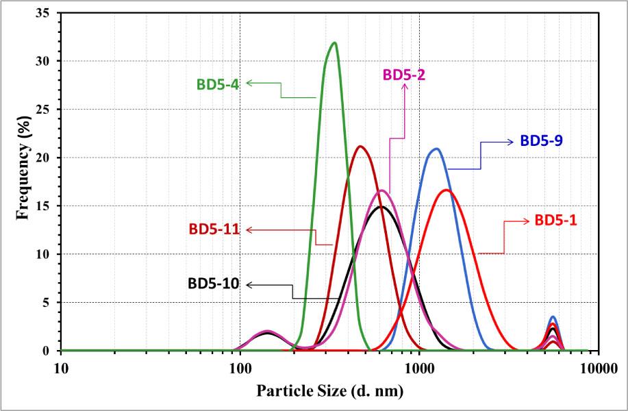 The distribution of particle size for BD5-1, BD5-2, BD5-4, BD5-9, BD5-10, and BD5-11 alloys. d, diameter