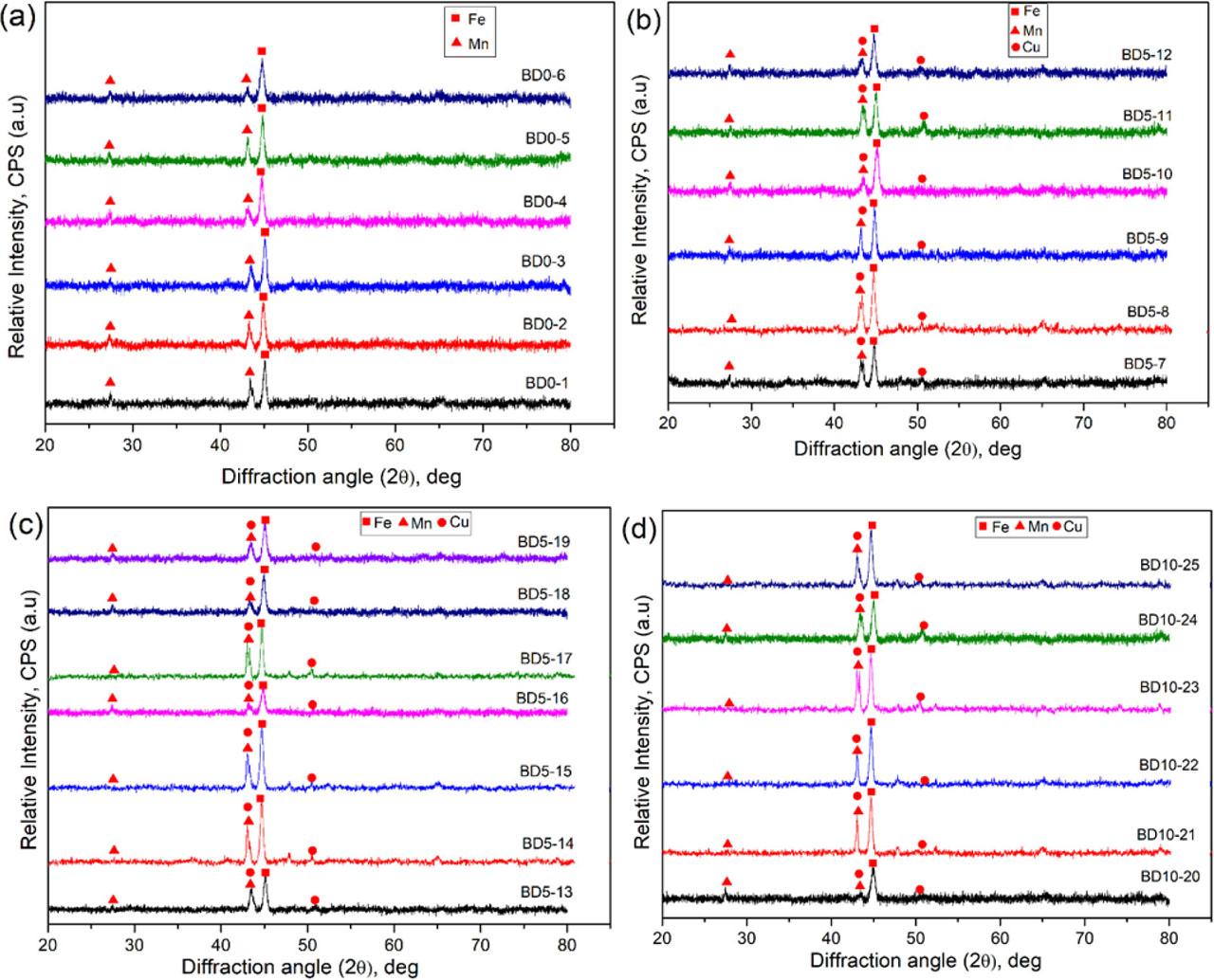 (Fe–35wt%Mn)100−x–Cux samples were processed (where x = 0 wt%, 5 wt%, and 10 wt%) using ball milling; a total of 27 alloy samples were produced, as green compacts, using various processing variables.