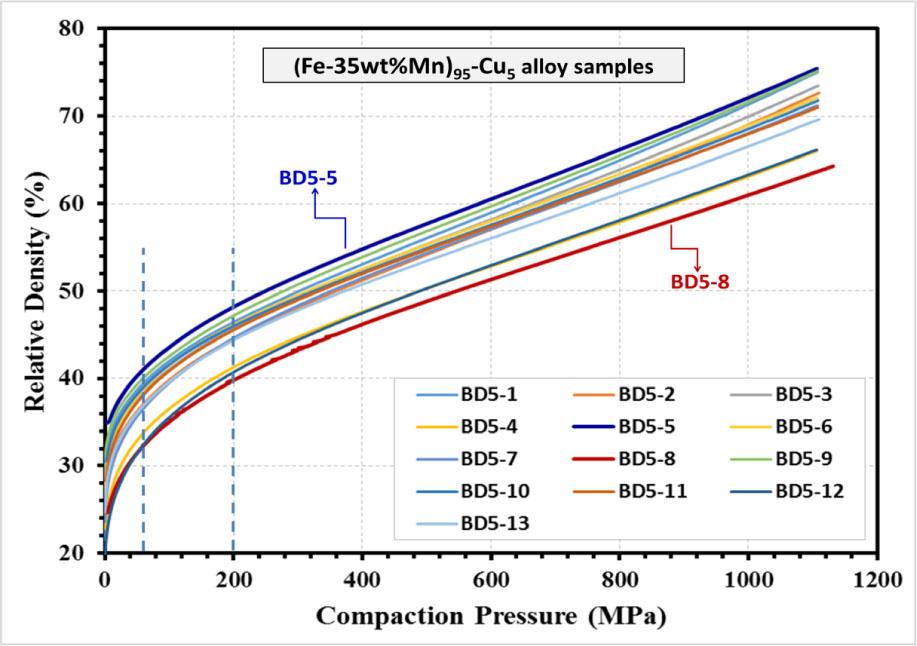 The compaction experiments were performed according to the input parameters listed in Table 1. The RDs at the maximum pressure applied at 1,100 MPa are shown in Table 1. Figure 6 displays the RD versus compaction load for selected samples of [(Fe–35 wt%Mn)95–Cu5]. From Figure 6, it is obvious that the RD for all samples revealed a continuous improvement with increase in the CP. However, the improvement rate in RD varied according to the controlling mechanisms of powder compressibility [32]. From Figure 6, a sharp increase in the RD of the samples up to ∼ 60 MPa is seen due to the particle ordering and rapid reduction in the spacing among the powders. Figure 6 also shows that in the CP ranging from ∼ 60 MPa to ∼ 200 MPa, the RD is still increasing but with a reduced slope due to the predominant mechanism of powder deformation, which led to extra contact areas among the powders and reduced pores [34]. Pressures >200 MPa were observed to produce more improvements in the compressibility until the maximum values of RD were reached at 1,100 MPa; however, the curve in this region revealed a lower slope due to the increased strain hardening of the powders, which resist further deformation and impede additional increase in the contact areas among powders [35]. With regard to the behavior of the selected samples presented in Figure 6, these 13 samples displayed the same general behavior of RD versus CP; however, these samples did not reveal the same RD at the applied loads, specifically, at the maximum CP of 1,100 MPa. The BD5-5 alloy displayed the maximum RD (75.46%), while the BD5-8 alloy exhibited the minimum RD (64.30%). The remaining 11 samples presented in Figure 6 were observed to display various RD values with CP between the maximum and minimum behaviors according to the various input parameters (Table 1). The sample with exceedingly high energy of ball milling involving the highest BPMR (15:1) and MS (300 rev/min) displayed the least value of RD due to the large stored energy, increased lattice strain, and great amount of work hardening in the processed powders. Therefore, the processed powders resist the compaction process and the final RD was reduced. On the other hand, the highest RD in Figure 6 was attained with a moderate energy of ball milling, which included BPMR (5:1), and MS (100 rev/min); in this case, the processed powders were still deformable with minimum strain hardening effect, which permitted more compressibility and enhanced the RD of the powders.