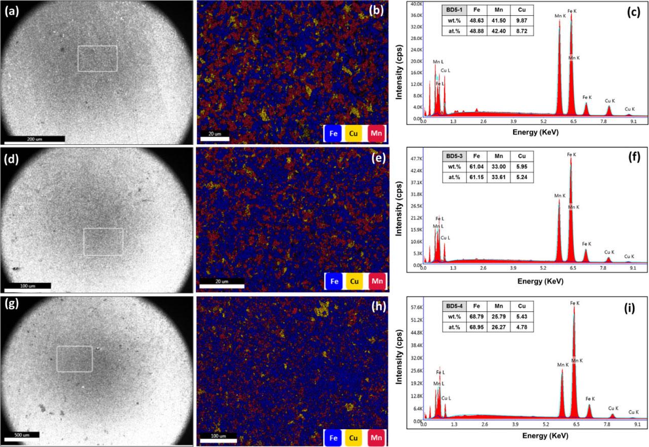 Results of EDS analysis of the alloys in powder form: (A–C) BD5-1; (D–F) BD5-3; (G–I) BD5-4. EDS, energy dispersive spectroscopy