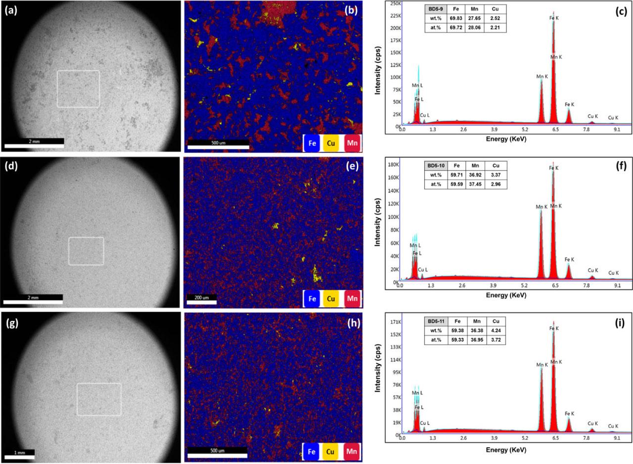 XRD analysis was performed on all samples to illustrate the effect of the input parameters of ball milling on the crystallite size and homogeneous lattice strain of the processed powders. The results of the selected samples (from Table 1) are discussed in this section. The selected samples include BD5-1 vs. BD5-2 to display the effect of MT; BD5-1 vs. BD5-3 to reveal the influence of BPMR; and BD5-9 vs. BD5-11 alloys to show the effect of MS. Figure 5 displays the XRD patterns of all samples for XRD analysis. The peaks were identified using X’Pert High Score Plus software, where the Fe [reference International Centre for Diffraction Data [ICDD]: 01-089-4186, space group: Im-3m(229)], Mn [reference ICDD: 00-001-1237, space group: I-43m(217)], and Cu [reference ICDD: 01-085-1326, space group: Fm-3m(225)] peaks were recognized, as illustrated in Figure 5. The estimated lattice strain and crystallite size are listed in Table 1. These features were determined using X’Pert High Score Plus software based on the major Fe peak only in each XRD pattern. With regard to the crystallite size, it was observed that increasing the MT from 1 h to 10 h resulted in a notable decrease in the crystallite size at various BPMRs and different MSs. The determined crystallite size for the BD5-1 sample milled for 1 h was 57.7 nm, compared with 18.2 nm in the case of the BD5-2 sample milled for 10 h. Similar observations when increasing the MT from 1 h to 10 h but at large BPMRs (BD5-3 vs. BD5-4 alloys) led to decrease in the crystallite size from 37.7 nm to 22.3 nm, respectively. The homogeneous lattice strain was noted to increase with increase in the MT, as shown in Table 1. For example, the estimated lattice strain for the BD5-1 alloy milled for 1 h was 0.165%, compared with 0.507% in the case of the BD5-2 alloy milled for 10 h. The effect of BPMR on the crystallite size and lattice strain was also examined, as listed in Table 1. For instance, increasing the BPMR from 5:1 (BD5-1 alloy) to 15:1 (BD5-3 alloy) led to a reduction in the crystallite size from 57.7 nm to 37.7 nm and an increase in the homogeneous lattice strain from 0.165% to 0.248%. Furthermore, the effect of MS on the crystallite size and lattice strain was investigated, as listed in Table 1. The increase in MS from 100 rev/min (BD5-9 alloy) to 300 rev/min (BD5-11 alloy) led to a considerable decrease in crystallite size from 57.6 nm to 21.3 nm and a substantial increase in the homogeneous lattice strain from 0.167% to 0.461%. Furthermore, increasing the energy input of the milling process resulted in elemental dispersion and alloying through the common mechanism of mechanical alloying, including deformation, welding, breaking, and rewelding of the elemental powders, leading to increased elemental alloying/dissolution of the mixed powders. For example, when comparing BD5-9 vs. BD5-11 samples, the energy input of milling for the BD5-11 alloy is higher than that of the BD5-9 alloy due to the high MS of 300 rev/min. Consequently, BD5-11 alloy displays greater peak broadening in the XRD patterns, with the disappearance of some peaks, compared with the XRD pattern of the BD5-9 alloy in Figure 5. These observations match the elemental mapping analysis presented in the next section wherein increased elemental dispersion and low agglomeration were observed for BD5-11 compared with the BD5-9 sample. These are indications of the formation of large extents of solid solution in the BD5-11 alloy compared with the BD5-9 alloy. Therefore, the extent of solid solution formation in the processed samples depends on the input parameters of the process. These findings ascertain that these parameters (MT, BPMR, and MS) play a major role in determining the microstructure features of the processed alloys. Augmenting the MT and/or BPMR and/or MS produced a substantial effect in terms of decreasing the crystallite size, increasing the lattice strain, and increasing the extent of solid solution formation. All these changes directly affect the subsequent material behavior, such as the compressibility and densification of the powders, as elaborated in the following sections.