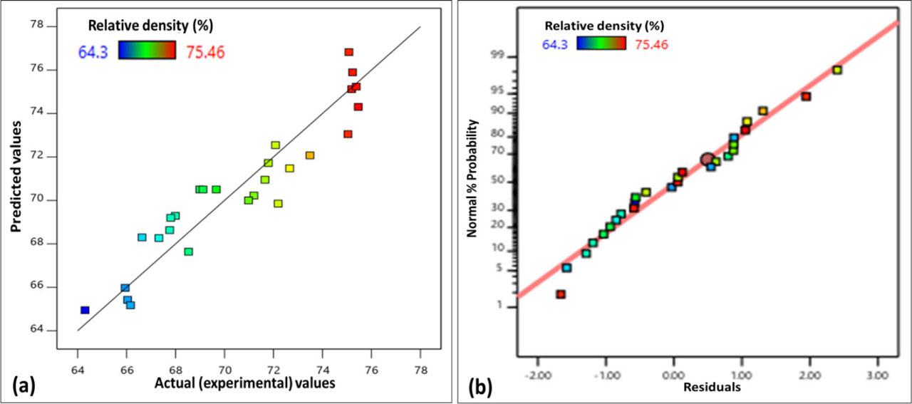 ANOVA results of RD: (A) The experimental and the predicted values of RD; and (B) normal probability of residuals of RD of the developed compacted samples. RD, relative density