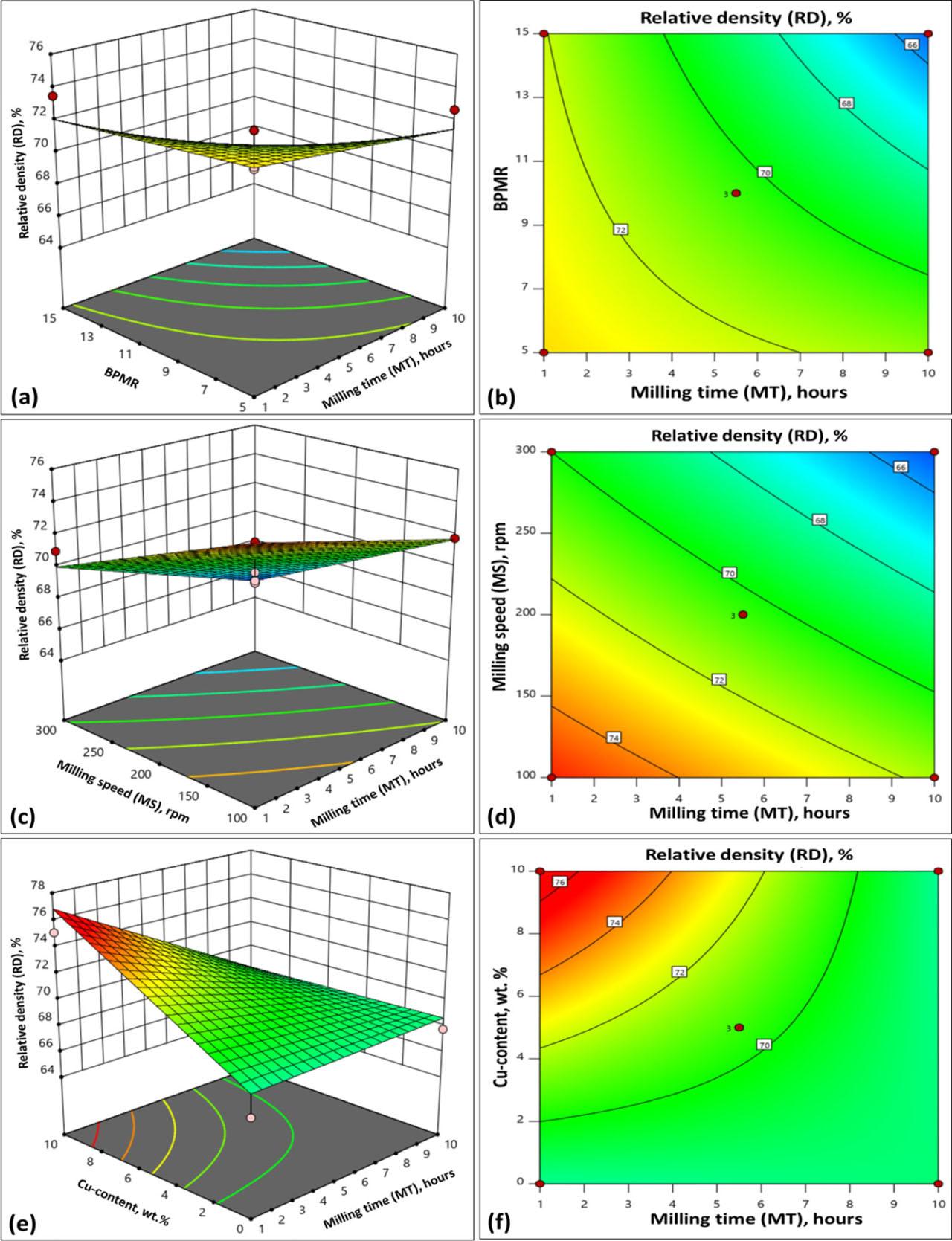 The impact of the input variables on the compactibility/RD of the developed alloy systems is presented in the form of 3D surface plots and 2D contour plots, as shown in Figure 10. Figure 10 (A–L) can be used for forecasting the RDs of the studied alloys. Figures 10A and 10B reveal the effect of the MT and BPMR on the RD. From the surface plot in Figure 10A and the contour plot in Figure 10B, it can be observed that the optimum RD and compressibility can be attained by decreasing the MT and BPMR. This behavior is due to the fact that increasing the MT and the BPMR results in increasing the energy of milling, which leads to increased lattice strain (as discussed in Section 3.3) and excessive plastic deformation of the powders [32]. The increased lattice strain and severe deformation of the powders impede the compressibility of the powders and decrease the RD [35]. Figures 10C and 10D show the impact of the MT and MS on the RD. From Figures 10C and 10D, it can be noticed that the RD decreased on increasing the MT and MS. Increasing the MT and speed led to high energy input during milling, which produced extra work-hardened powders with a substantial amount of lattice strain, which resists the compression and reduces the RD [34]. Figures 10E and 10F reveal the impact of MT and CC on the RD. Concerning Figures 10E and 10F, it can be seen that the RD improved by decreasing the MT and increasing the CC. Increasing the CC led to an improved RD because copper is a ductile element and increasing its content promoted the mechanism of compaction process through providing more deformability of the powders. Figures 10G and 10H illustrate the influence of MS and BPMR on the RD; it can be observed that the powder's compactibility and RD were enhanced on reducing the MS and/or BPMR due to the decreased power input during milling. Figures 10I and 10J show the influence of BPMR and CC on the RD, and it can be concluded that the powder's compactibility and RD were enhanced on increasing the CC and/or reducing the BPMR. Figures 10K and 10L display the influence of MS and CC on the RD; it can be perceived that the RD was enhanced on reducing the MS and/or increasing the CC.