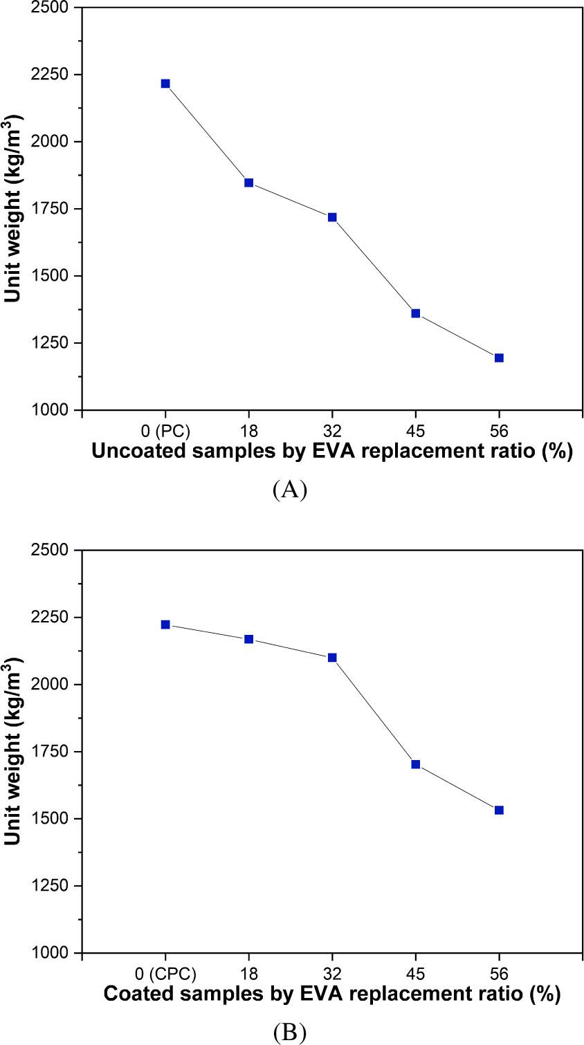 Unit weight changes of cementitious samples depending on (A) EVA replacement ratio by volume (B) EVA replacement ratio by volume and GFRP coating process. EVA, ethylene vinyl acetate; GFRP, glass fiber woven fabric