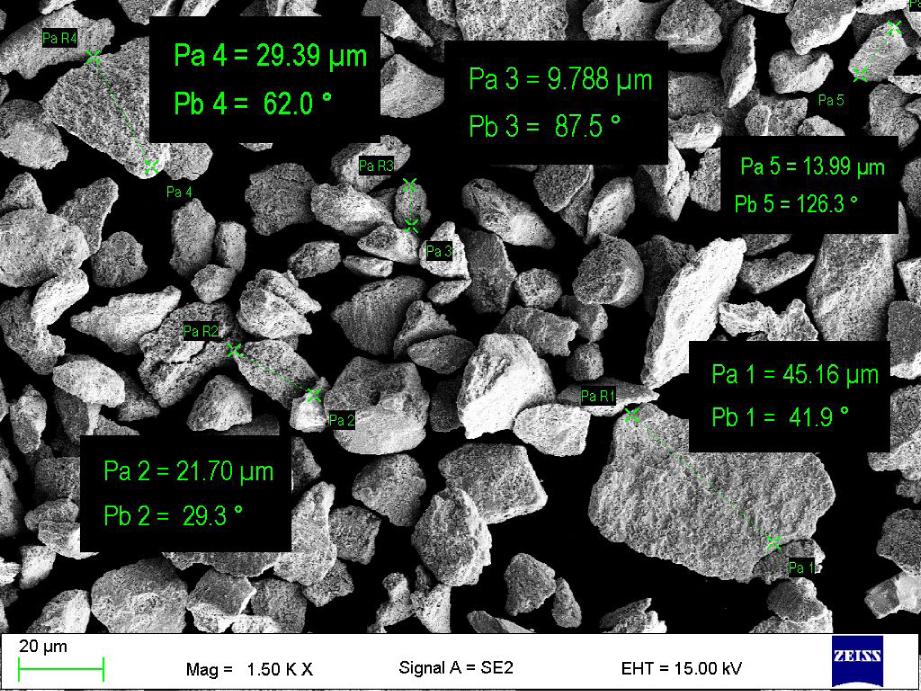 Morphology of initial feedstock power (SEM-SE) with random measurements of particle size. SEM, scanning electron microscope