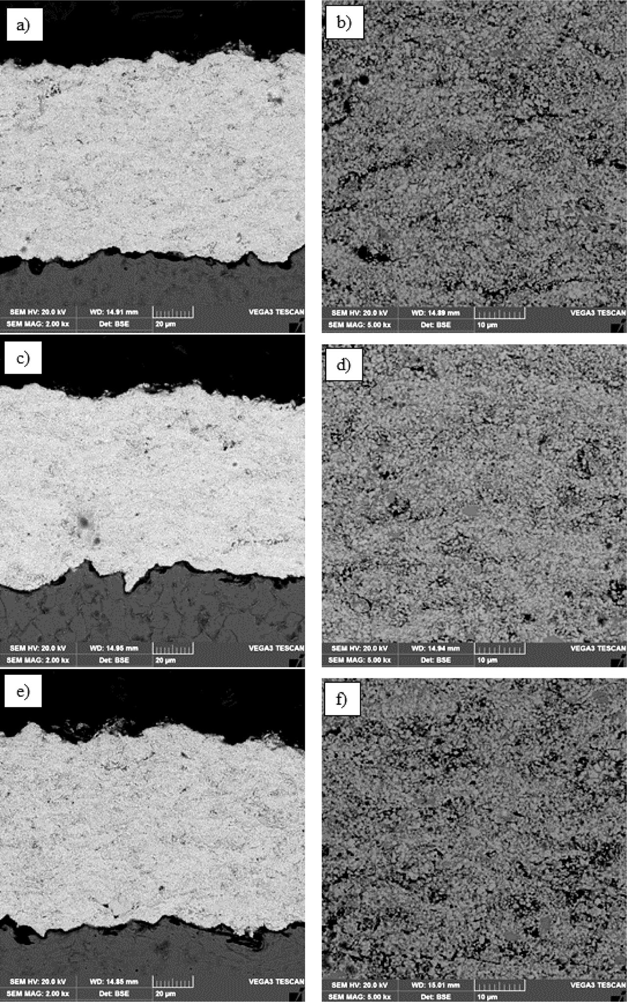 The metallographic samples were prepared by a standard procedure, which is as follows: samples were mechanically cut, embedded in epoxy resin and then ground and polished. The microstructure of manufactured coatings was analysed using a scanning electron microscope (SEM), Tescan Vega 3 (Tescan Orsay Holding).