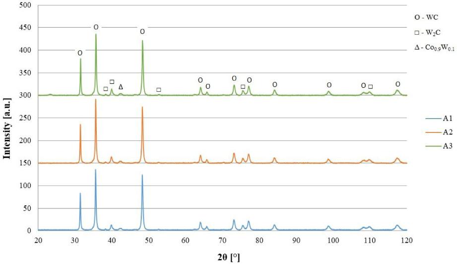 Phase compositions of the deposited coatings are presented in Figure 5. In all coatings, hexagonal WC (PDF#00-061-0244) was the main phase. The second phase, hexagonal W2C carbide (PDF#00-035-0776), appeared. Thus, it is evident that during coating deposition, partial decarburisation of WC has taken place. It is a well-known mechanism for tungsten carbide coatings [45, 46].