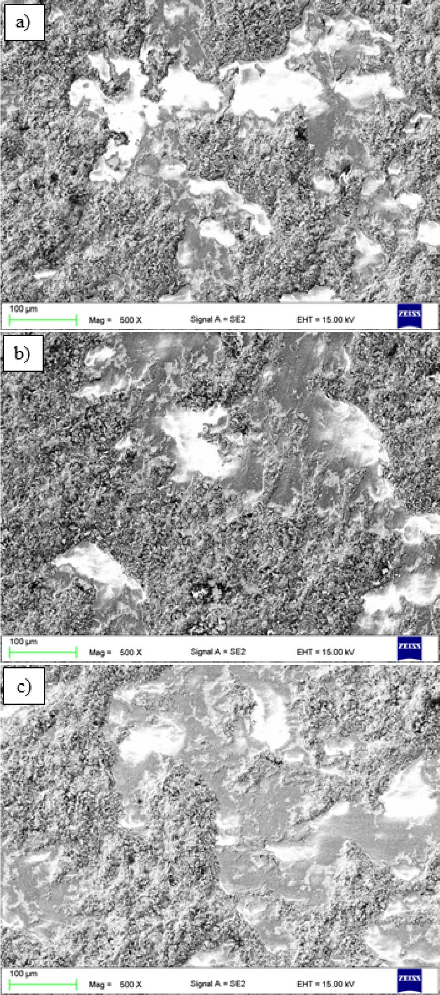 In order to understand the wear mechanism, the worn surfaces of investigated samples were examined by SEM. The wear traces of tested samples are presented in Figure 6. Identification of wear mechanism and occurred phenomena should take into account, that it is affected by two phases structure of cermet materials (hard grains and soft matrix). On the other hand, the wear resistance of HVOF sprayed coatings depends on many factors, e.g. microstructure, hardness, cohesion in the coating and porosity level [57]. The detailed analysis of wear traces of the tested coatings leads to the conclusion that two types of mechanism occurred: (i) subsurface plastic deformation and (ii) brittle cracking [51]. It should be stressed that these two mechanisms occur simultaneously. Due to the friction between two bodies, shear stresses occur, which makes possible the plastic flow of the soft metal matrix. On the other hand, during the brittle cracking, coating material detachment has occurred. Mainly, hard carbides particles are removed [58]. In all samples, the specific friction layer is built on their surface (Figure 6).
