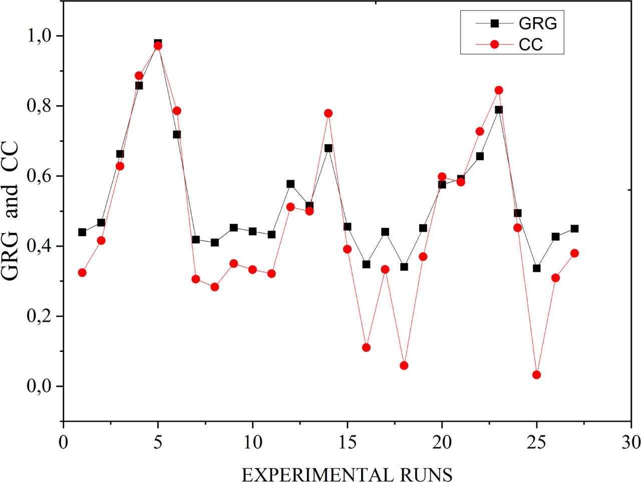 | Run | Deviation Tensile strength | Sequences Brinell hardness | (Δ0i) Microhardness | GRC Tensile strength | Brinell hardness | Microhardness | GRG | Rank |