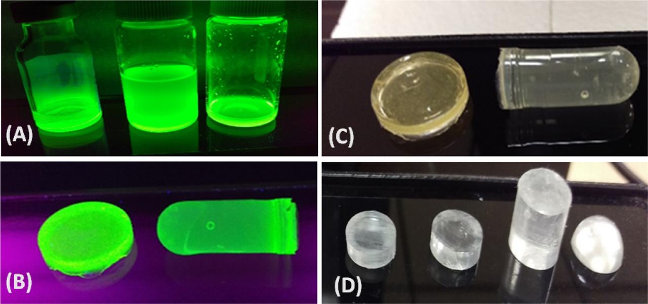 Digital images of samples (A) PQ-Dot solution; (B) PQ-Dot solid composite polymer rods and disks exposed to ultraviolet lamp; (C and D) PQ-Dot composite rods before and after cutting the rods