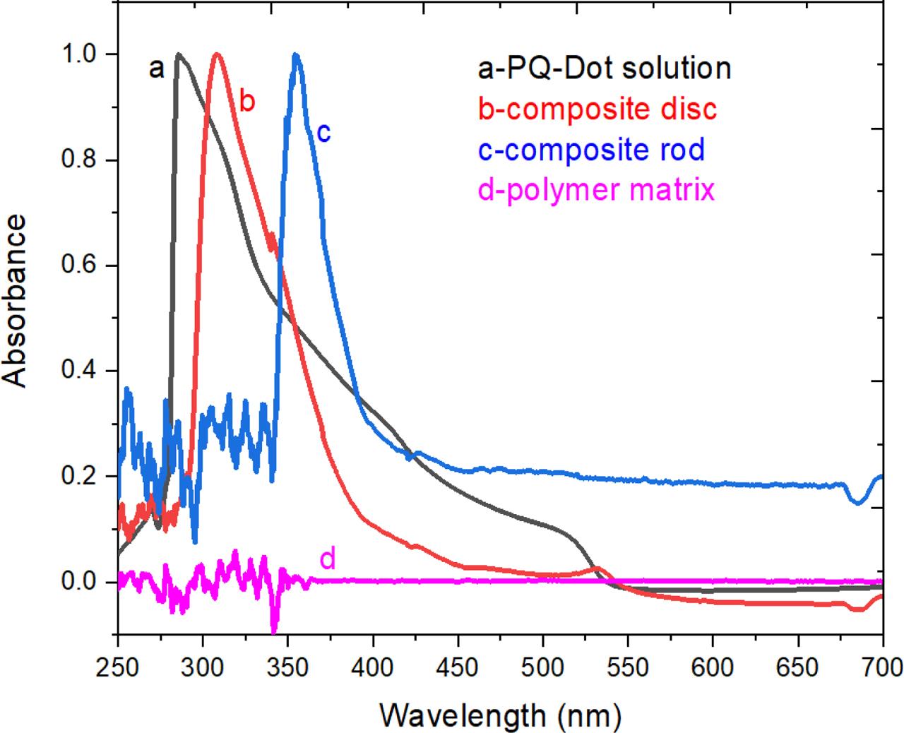 Absorption spectra of PQ-Dots: (a) solution; (b, c) composite solid samples; and (d) polymer matrix