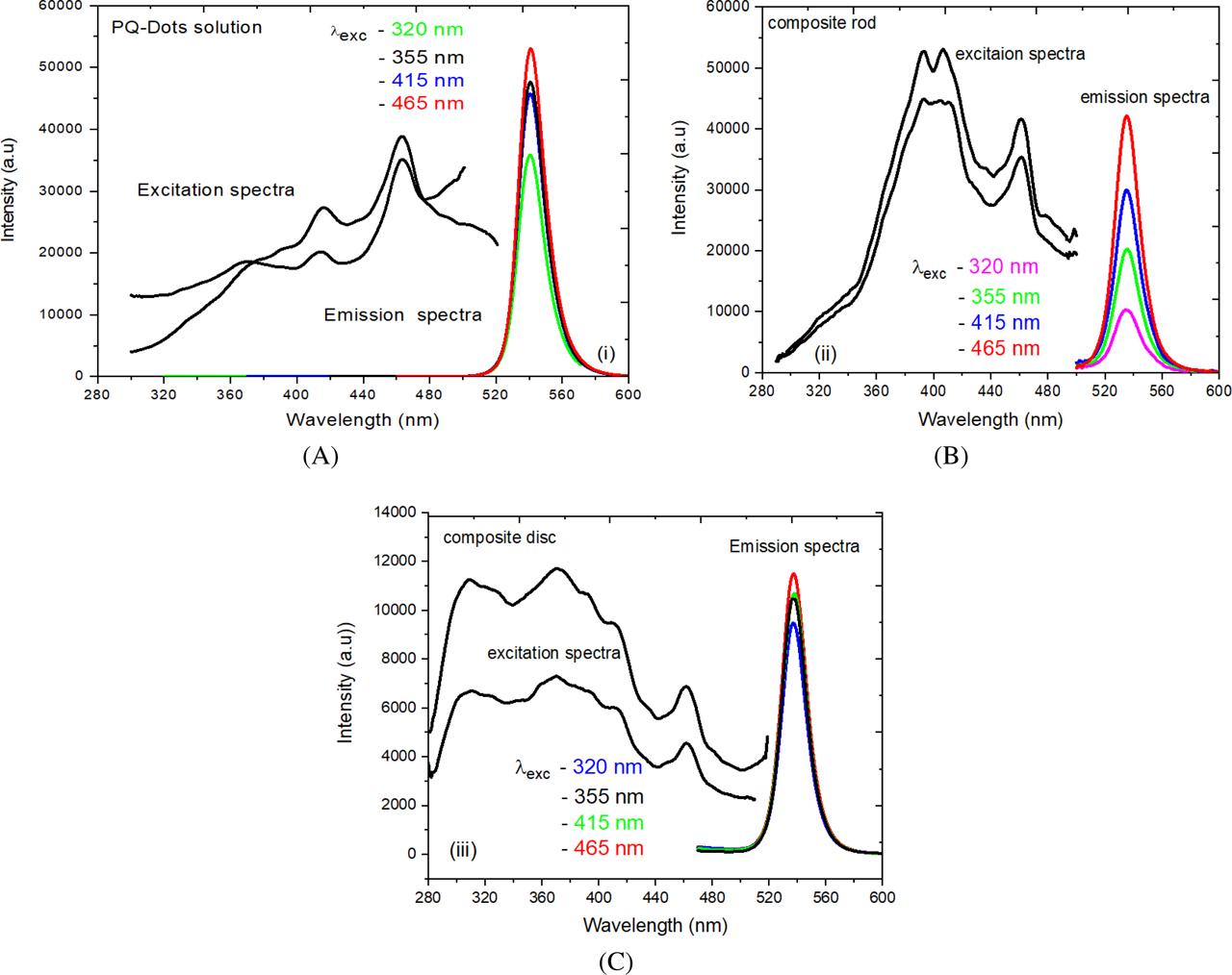 Emission and excitation spectra of PQ-Dots excited at different wavelengths: (A) solution; (B) composite rod; and (C) composite disk