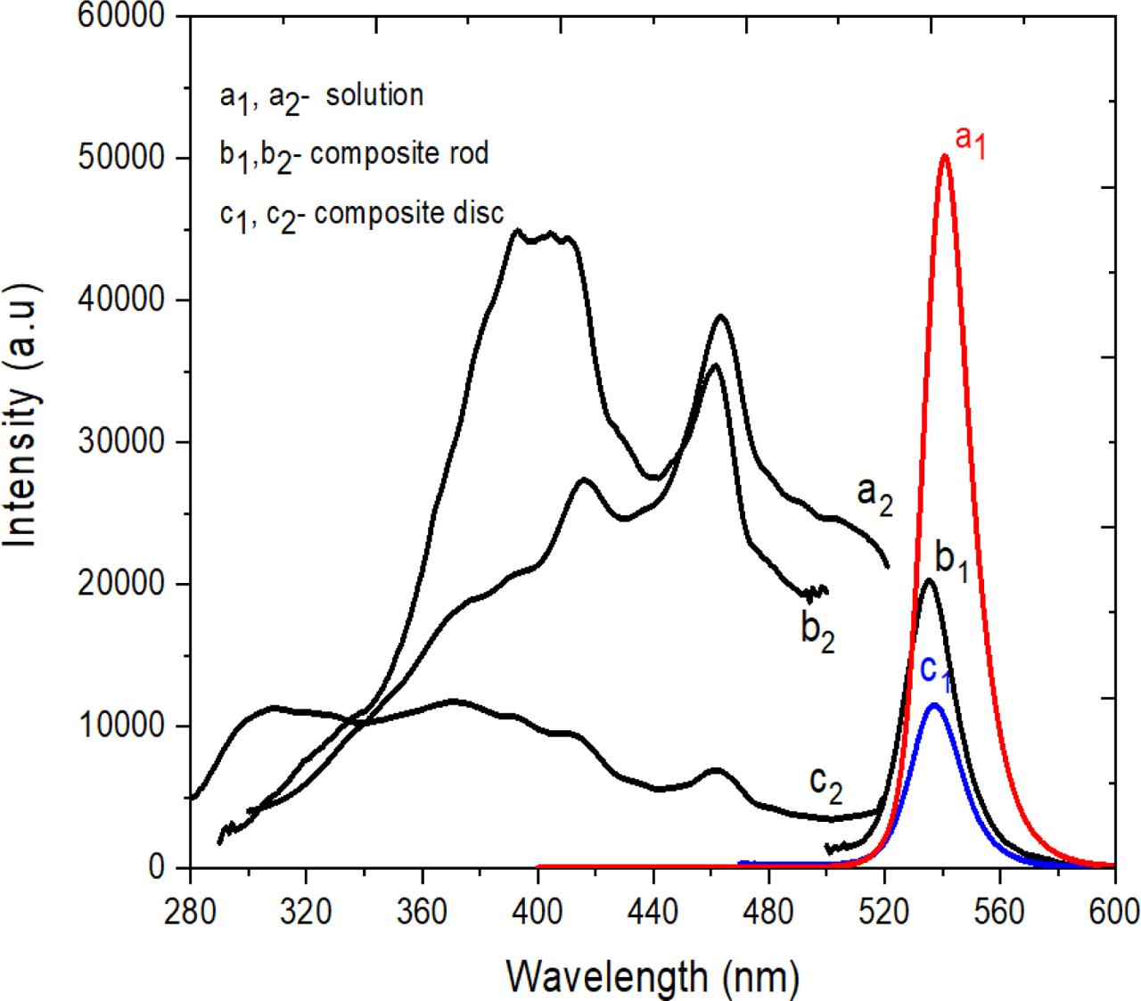 The comparison of the emission and excitation spectra between PQ-Dot solution and composite solid is shown in Figure 4. The observed emission peaks a1, b1, and c1 correspond to their excitation spectra a2, b2, and c2, respectively. The excitation peaks of the PQ-Dot solution noticeably changed when the PQ-Dots were deposited in the solid matrix. As clearly seen in Figure 4, the emission and excitation peaks are influenced by the solid matrix.